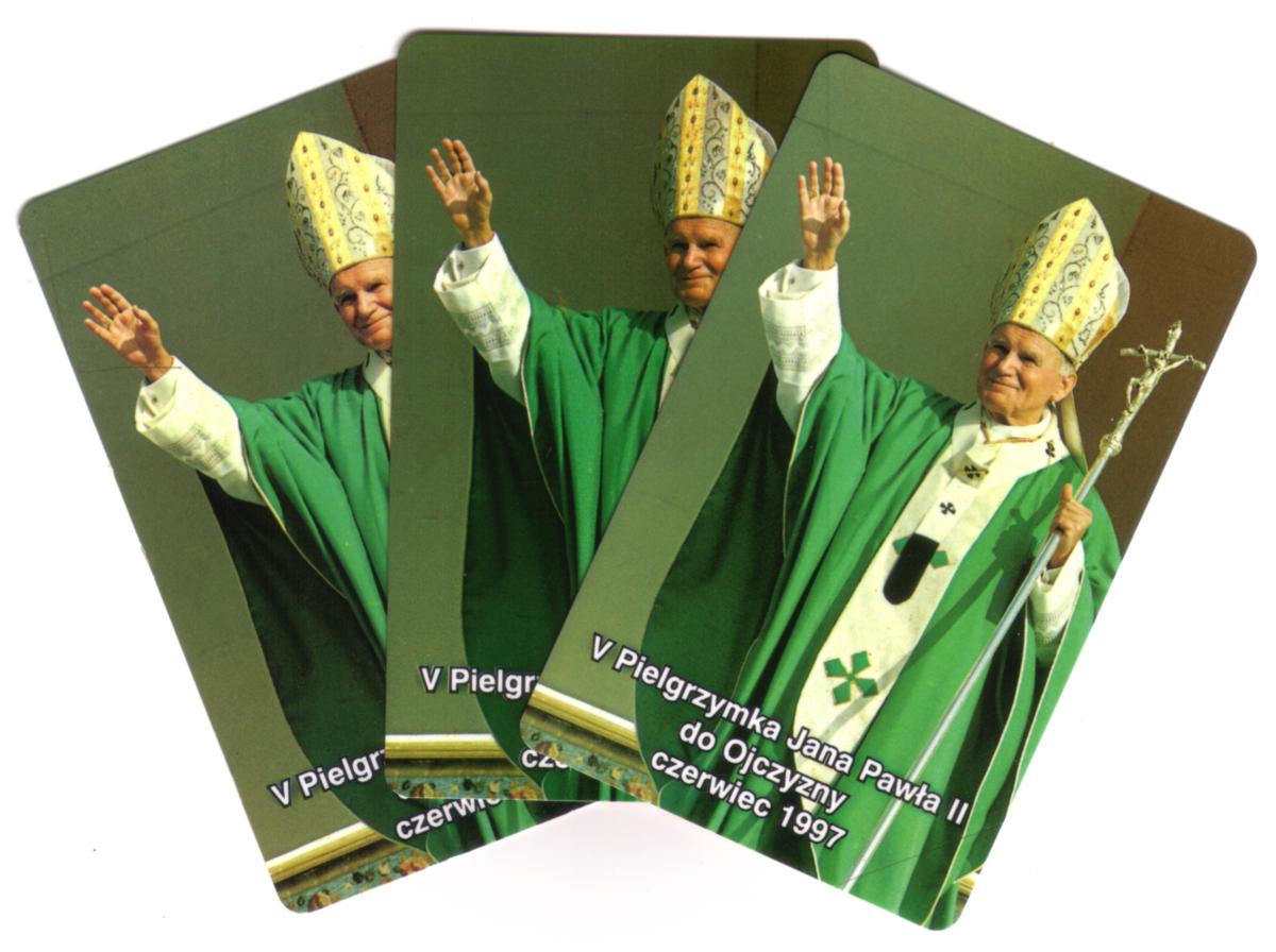 The design centers on the Pope as a religious and spiritual figure, capturing his role and presence during the 1997 pilgrimage. The cards are a tribute to Pope John Paul II’s legacy and are collectible items linked to Polish Catholic history.