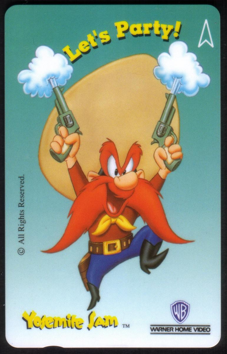 This collectible phone card features a colorful cartoon image of Yosemite Sam, a well-known character from Warner Bros. animated shorts. Yosemite Sam is illustrated with his signature bushy red mustache and large cowboy hat. He is holding two six-shooter handguns, one in each hand, with smoke coming out of the barrels, indicating that he has just fired them. Above the illustration, there is a speech bubble where Yosemite Sam enthusiastically exclaims, "Let's Party!"