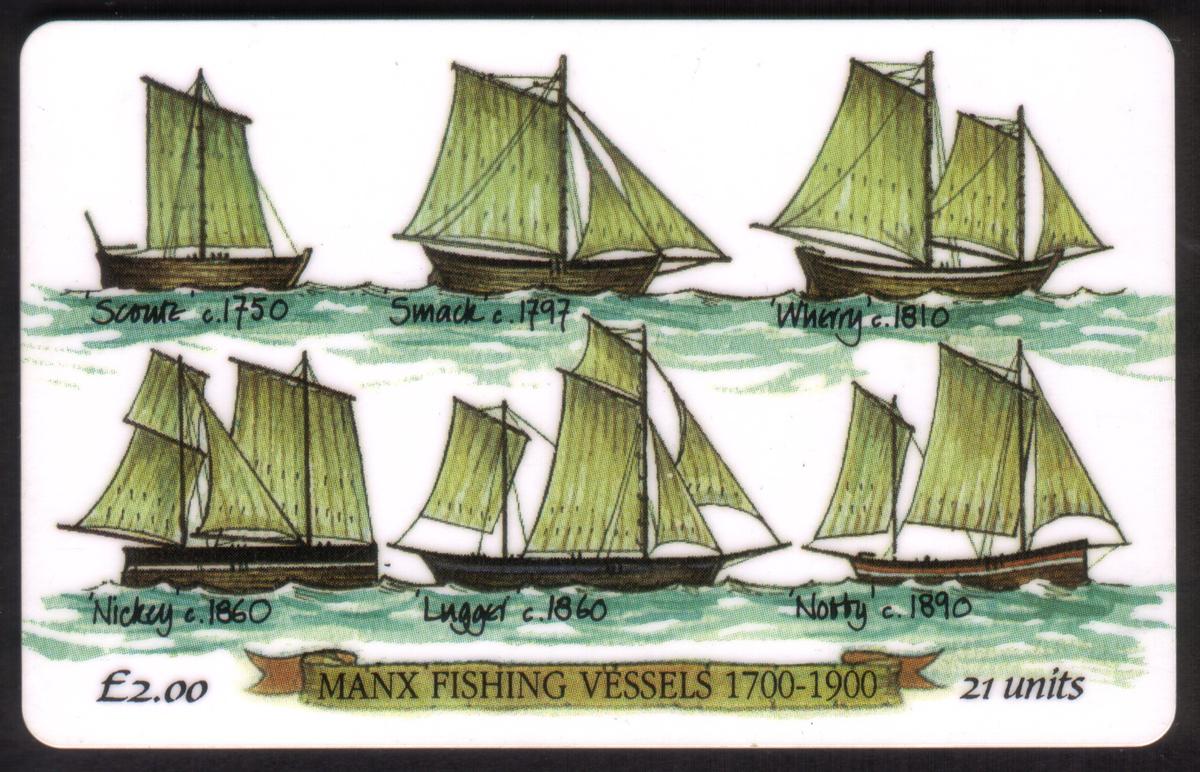 Below the images, a banner reads "MANX FISHING VESSELS 1700-1900" with the denomination of "£2.00" at the left and "21 units" on the right side of the card. The card’s style reflects maritime heritage, highlighting the traditional fishing vessels used around the Isle of Man during this historical period.