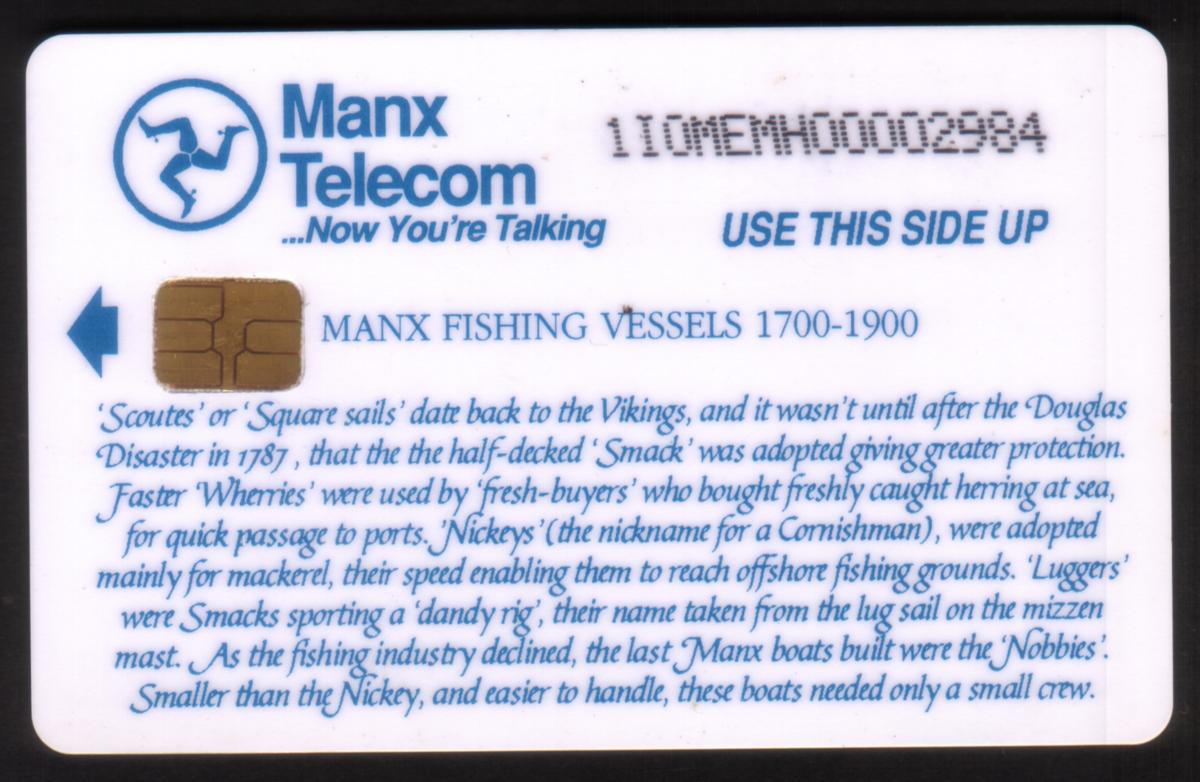 This collectible chip card from the Isle of Man features detailed colored illustrations of six historic Manx fishing vessels dating from 1700 to 1900. Each vessel is depicted sailing on a green-tinted sea with a light blue sky behind. The vessels all have green sails and various hull shapes, reflecting the evolution of fishing boat design over two centuries.