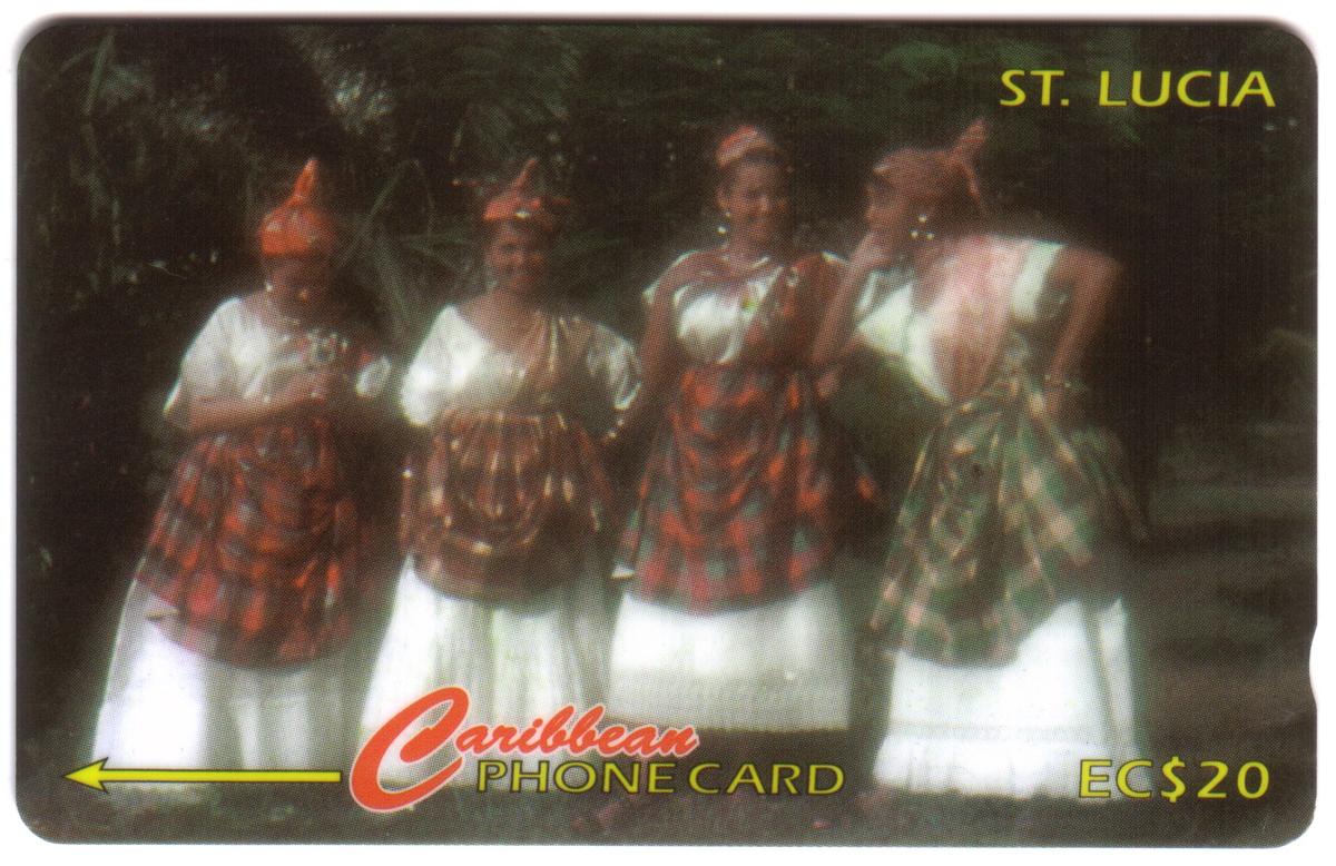 This card is a collectible used phone card issued by WorldCom. It highlights the cultural traditions of St. Lucia through the depiction of women in traditional dress, combining vibrant colors, cultural symbolism, and official branding to create a distinct representation of the island’s heritage.