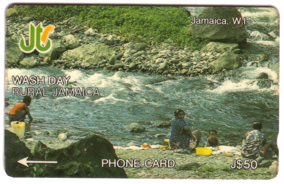 This collectible phone card from Jamaica features an image titled "Wash Day In Rural Jamaica - Washing Clothes In The River." The central visual depicts clothes being washed in a flowing river, showcasing a traditional and hands-on method of doing laundry commonly practiced in rural areas of Jamaica. The scene emphasizes the connection between daily life and natural water sources essential for this activity.