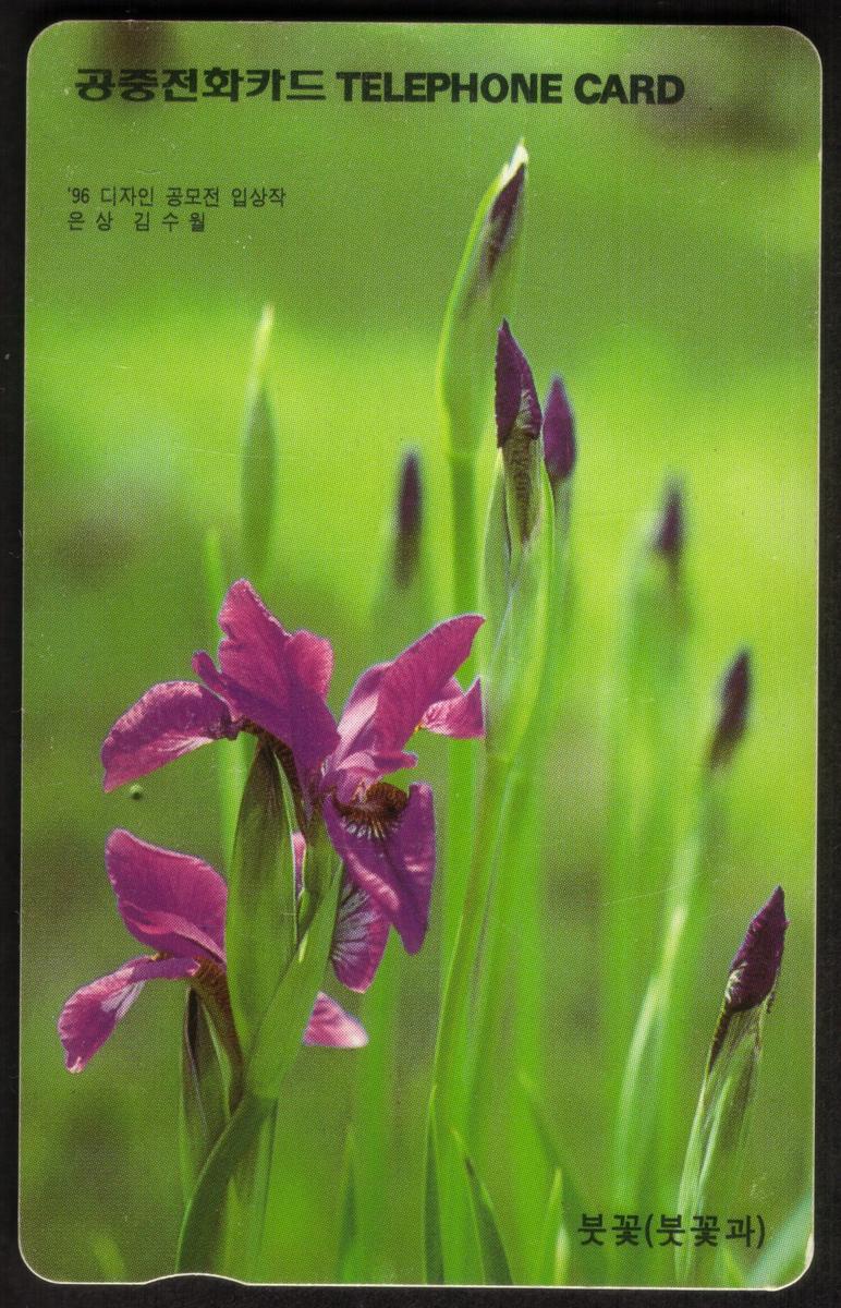 This collectible phone card from South Korea features a vibrant design of red iris flowers prominently displayed on the front. The flowers are arranged with detailed petals and green stems, showcasing the natural beauty of the iris blooms. The card includes the text "Korea Telecom 2000" printed clearly, identifying the telecom company and the year of issue.
