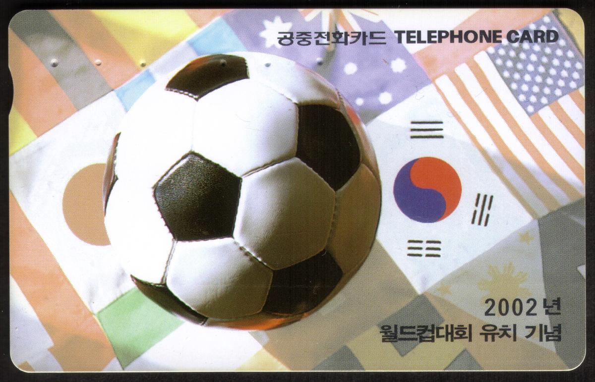 In the upper left corner, the text "Korea Telecom" is printed in blue, confirming the issuing company. This phone card was issued for use in South Korea and has a stored value capability, making it functional as well as collectible. The minimalist, clean design emphasizes the theme of soccer with national pride symbols, combining both sporting and cultural significance.
