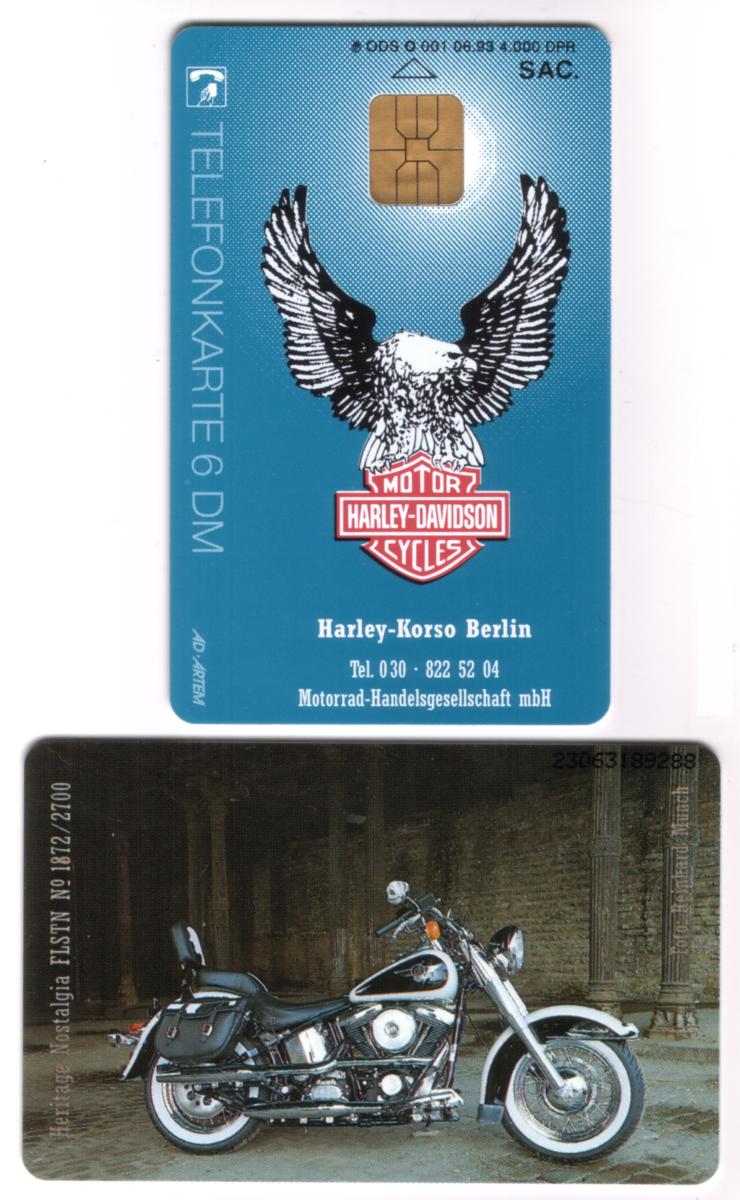 Text is displayed on the left side of the card. At the top left is the phrase "Harley-Korso Berlin Germany," highlighting an event or location related to Harley-Davidson motorcycles in Germany. Below that, in smaller text, are the words "heritage nostalgia FLSTN No 1872/2700," indicating a specific numbered or limited edition model tied to Harley-Davidson’s heritage line, specifically the FLSTN model. The bottom left corner has text that reads "6dm," denoting the stored value on the chip card. Above the value is the word "Germany," affirming the card's country of origin or use.