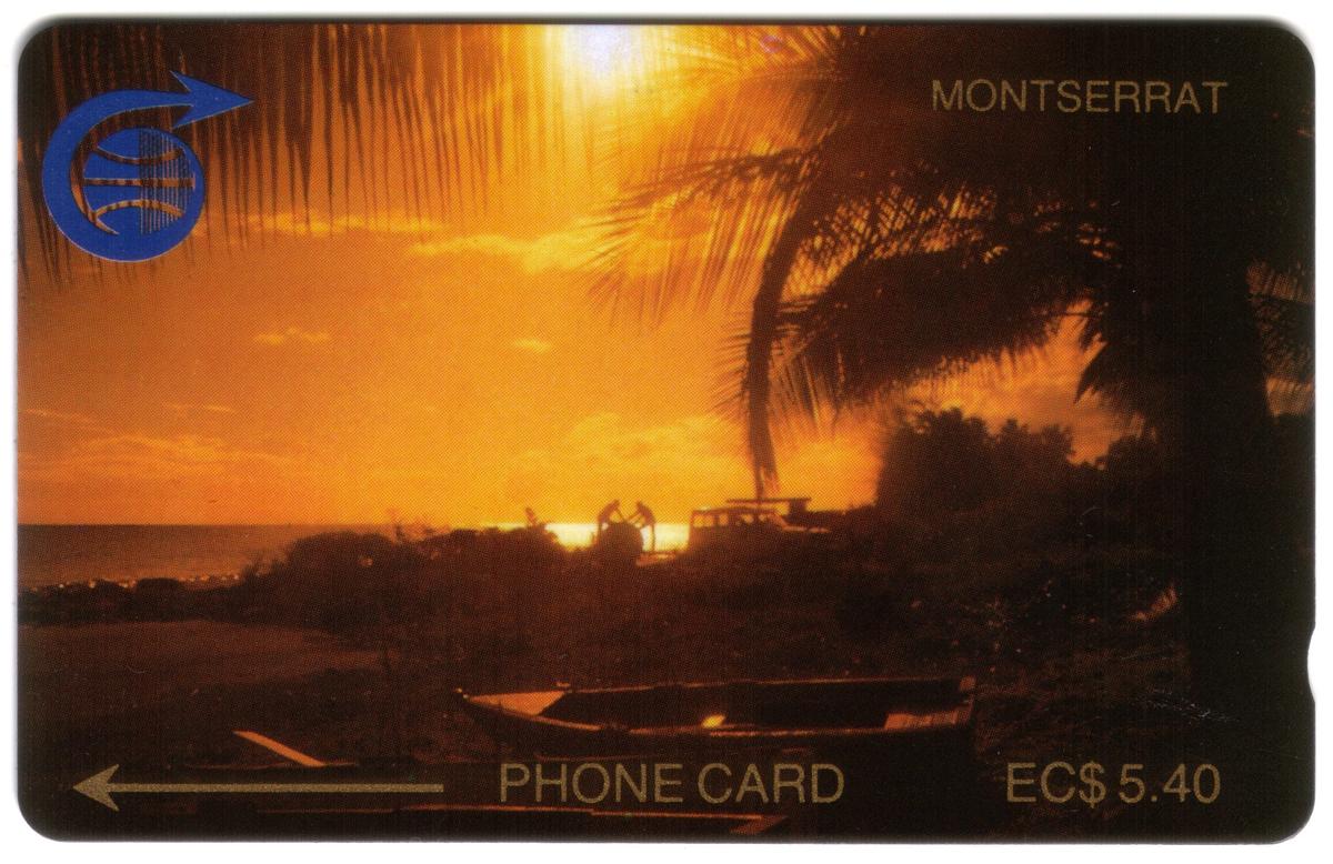 This collectible optical stored value card features a vivid sunset scene over a beach in Montserrat, a Caribbean island. The image captures the warm glow of the setting sun reflecting across the water and sandy shore, with a soft gradient sky transitioning from orange to light blue. The scene includes gentle waves lapping at the beach, conveying a tranquil coastal atmosphere typical of Montserrat’s natural beauty.