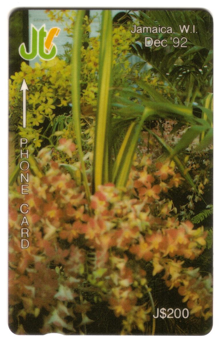 Overall, the card combines floral imagery with clear branding and denomination details, serving as a distinctive collectible representing Jamaican floral themes and telecommunication history.