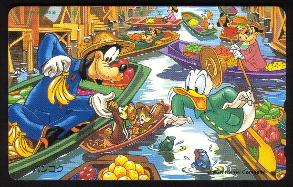 Additional Disney characters Goofy and Donald Duck appear on the card, connecting it to the "Disney Voyage To Thailand" theme. The card emphasizes the Disney cartoon and comic style through its detailed, animated artwork. The card is in mint condition with no holes, preserving its collectible quality.