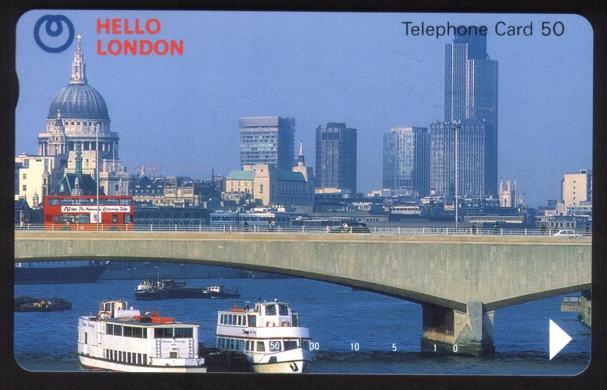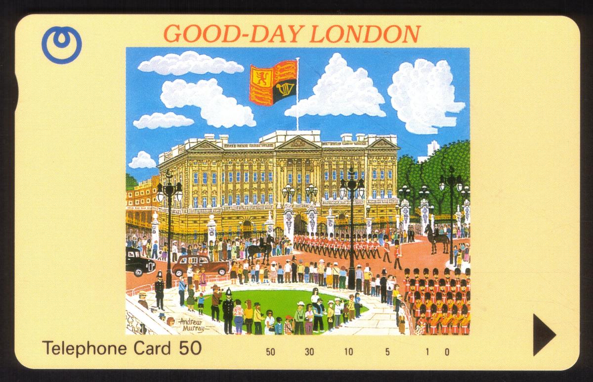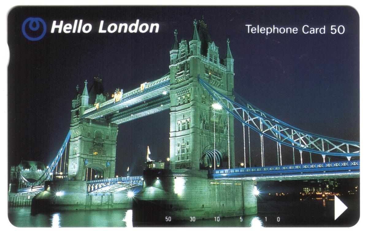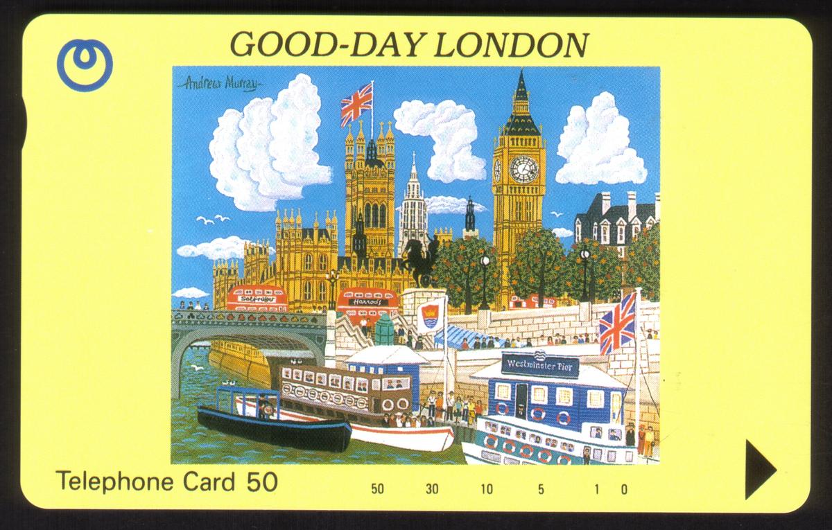 This set includes four collectible phone cards from Japan featuring iconic landmarks of London, England. Each card prominently displays a well-known symbol of the city against a bright, clear sky with partial branches of trees framing the scenes. The cards are labeled with phrases such as "Hello London" and "Good-Day London," highlighting a welcoming theme.