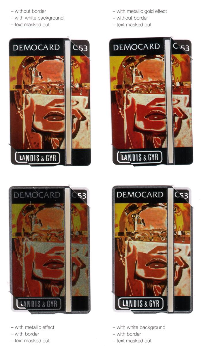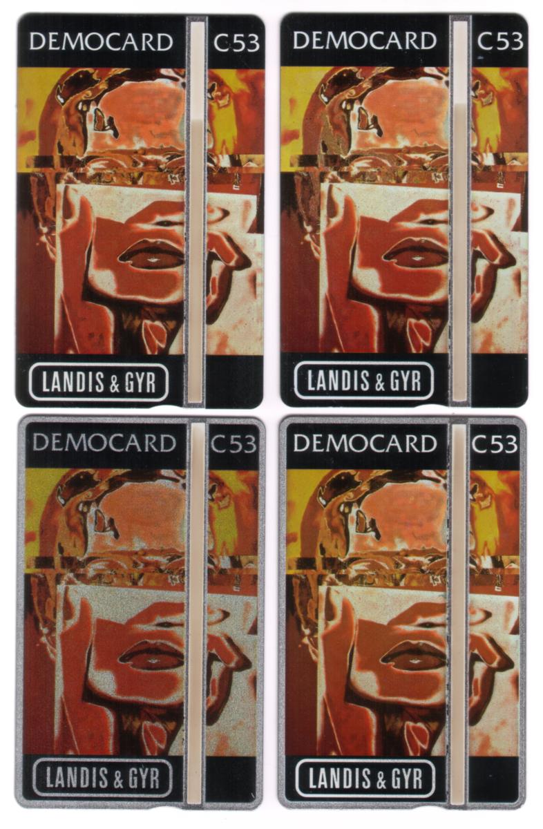 Each card is marked with "DEMOCARD" at the top center, with "C 53" located at the top right corner in a black rectangular area. The bottom left corner of each card displays the text "LANDIS & GYR" in white on a black background. The cards vary slightly in their graphic effects: one has a white background without a border, another features a metallic gold effect, another includes a metallic effect with a border, and one has a white background with a border.