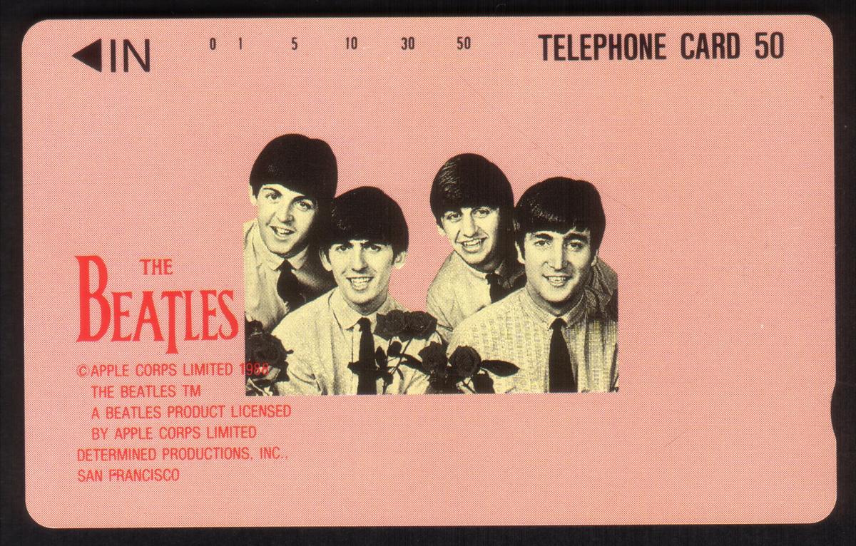 The card was produced in Japan in 1988 by Apple Corps Limited, as indicated by the text on the card. It is marked with the number 50u, which signifies its unit value. Additional details printed on the card include the number 38734 and the designation "J90N." The card’s design emphasizes the theme of rock bands and music, celebrating The Beatles as influential musicians.