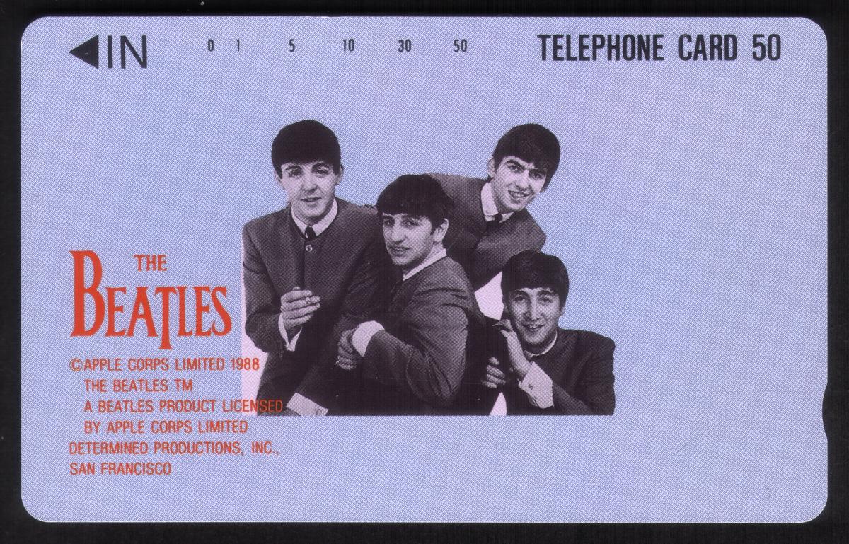 This collectible telephone card features a photographic image of The Beatles, the iconic British rock band, with all four members—Paul McCartney, Ringo Starr, George Harrison, and John Lennon—posing together. The group appears in black and white, set against a light blue background. The band members are dressed in suits, reflecting their early-career style.