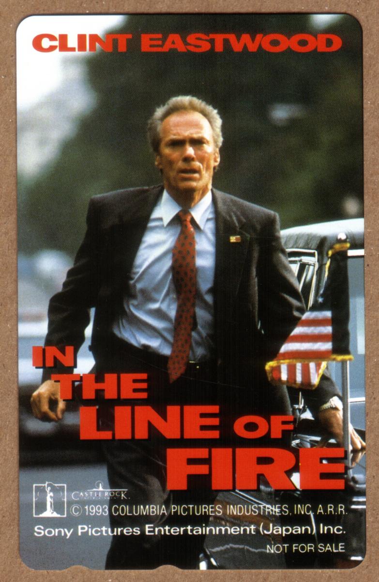 This collectible card from 1993 features promotional artwork for the movie *In the Line of Fire*, produced by Columbia Pictures and Sony Pictures Entertainment. The card was issued in Japan and shows actor Clint Eastwood prominently on the front. Clint Eastwood is depicted wearing a suit and tie, holding a gun in a stance that reflects his role in the film. The movie title "In the Line of Fire" is clearly displayed on the card.