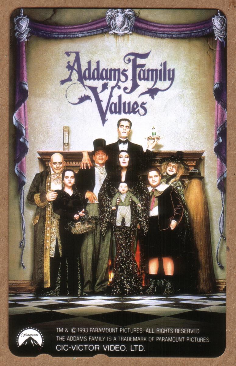 Produced in Japan, this promotional card is associated with CIC-Victor Video and bears the code "50u." The card is in mint condition, with no holes or damage evident in the image. The front of the card displays the *Addams Family Values* movie branding clearly, alongside relevant Japanese text and logos, indicating its origin and official licensing tied to the Japanese market in 1993.