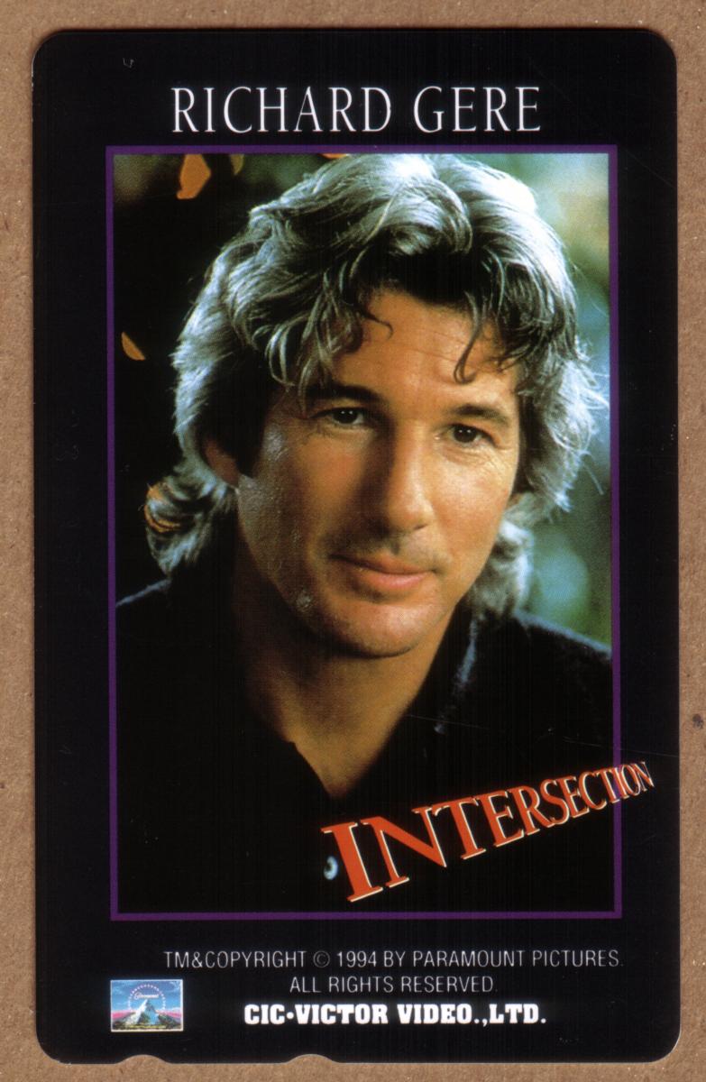 This collectible phone card was issued in Japan in 1994 by Paramount Pictures and Cic-Victor Video. It features a promotional image related to the movie "Intersection," starring Richard Gere. The card displays a photographic still of Richard Gere, set against a subdued, urban background, emphasizing his facial expression and mood. The "Intersection" movie title is printed on the card, along with the logos of Paramount Pictures and Cic-Victor Video.
