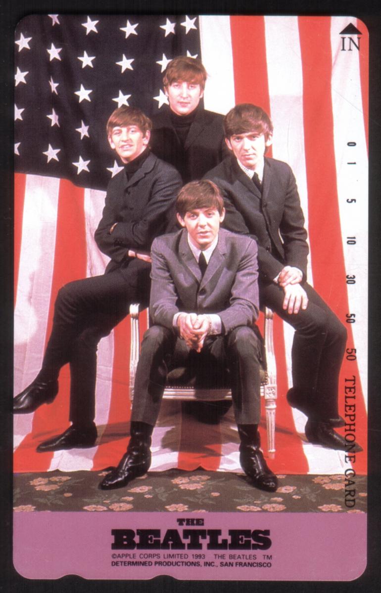 This collectible phone card from Japan features the iconic British rock band, The Beatles, posing in front of the American flag. The image shows all four members dressed in dark suits. One member sits confidently on a chair at the center front, while the other three stand or lean behind him, each with a distinct and relaxed posture. The background consists of the United States flag with its red and white stripes and white stars on a blue field.