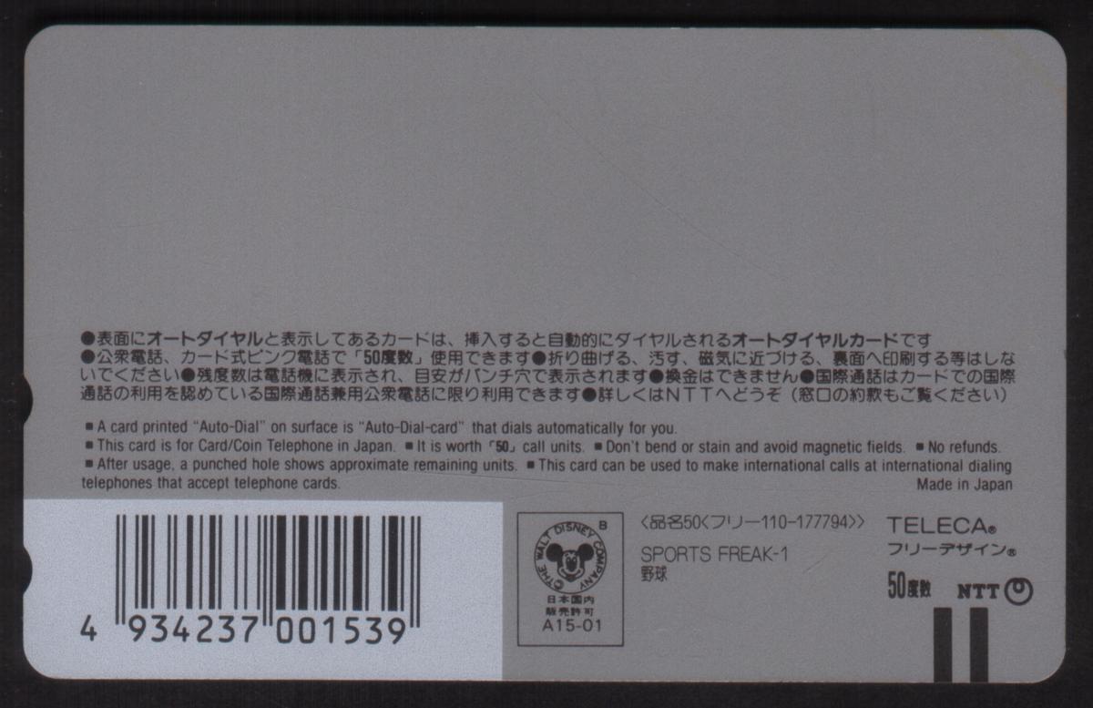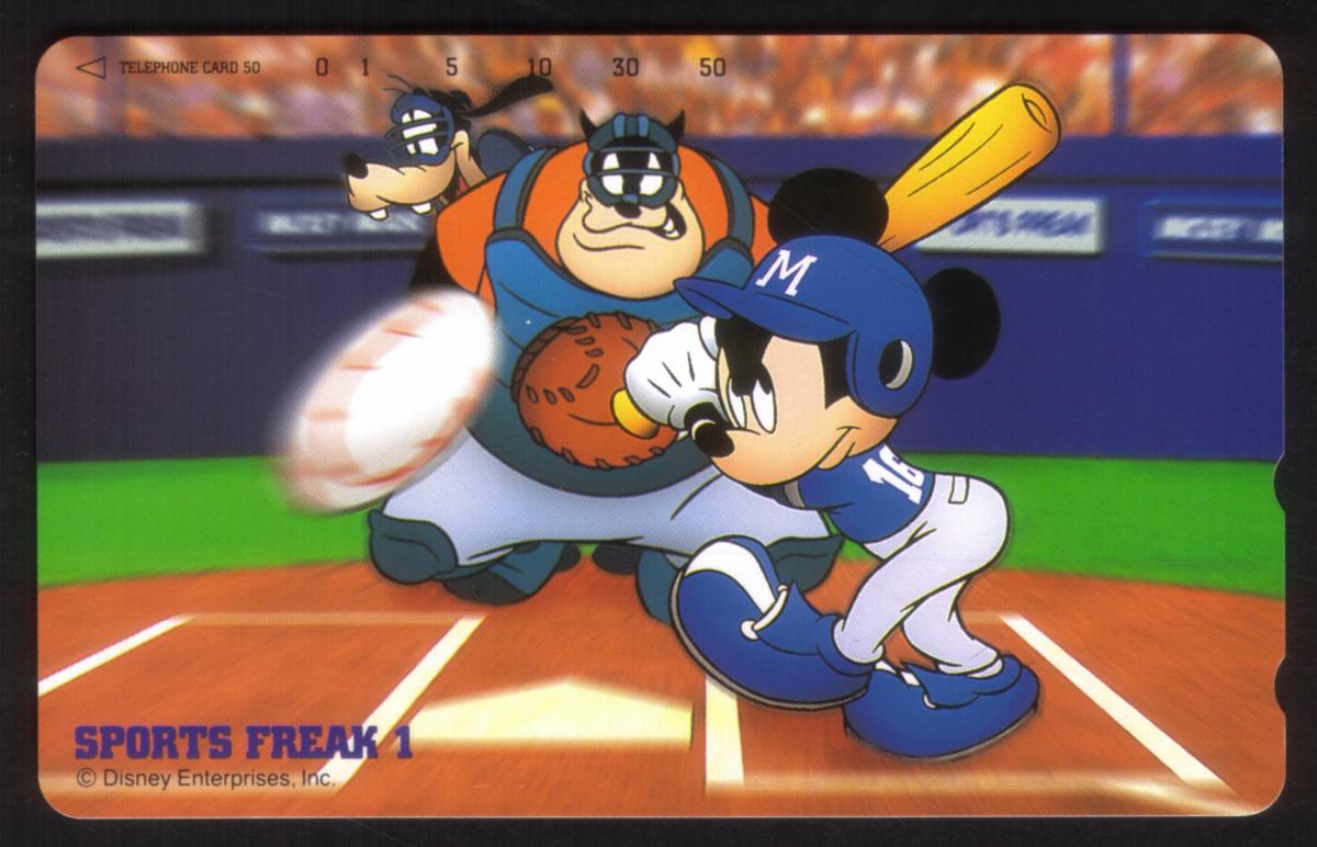 In the lower left corner of the card, bold purple text reads "SPORTS FREAK 1," with the copyright attributed to Disney Enterprises, Inc. The card’s perforated top row features number markers (0, 1, 5, 10, 30, 50) indicating its use as a prepaid phone card with a value of 50 units. The vibrant artwork and characters emphasize Disney’s playful sporty spirit, making it a unique and appealing collectible for Disney and baseball fans alike.