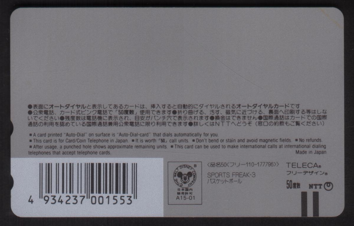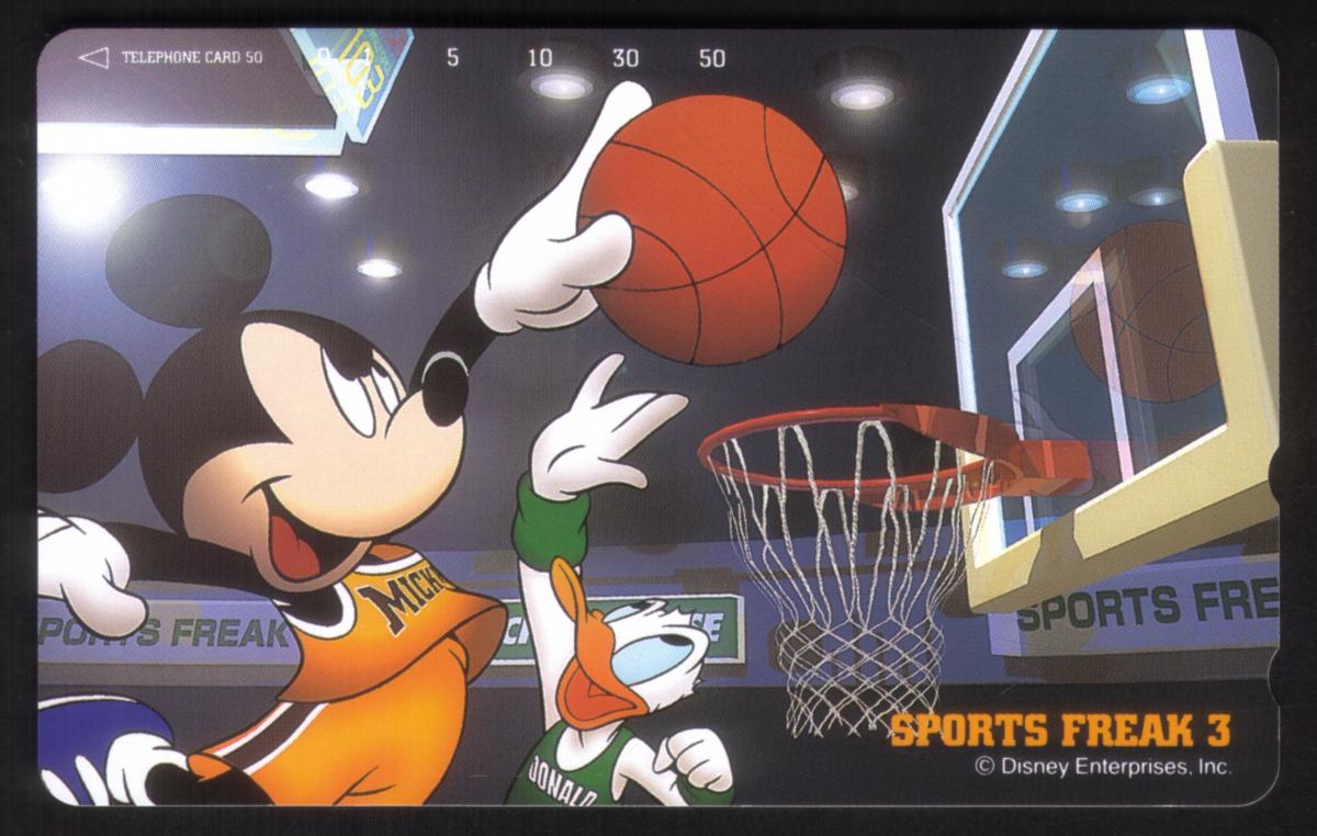 This card is part of a sports-themed series from Japan associated with Disney. It shows a dynamic moment of Mickey Mouse dunking a basketball, with Donald Duck engaging actively on defense, reflecting the fun blend of Disney characters and basketball sports imagery. The phone card is in mint condition with no visible damage or holes.
