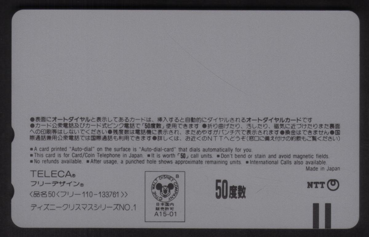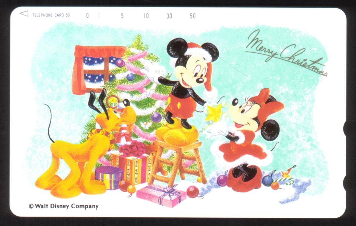 Above the design, the card displays a series of numbers and the text “TELEPHONE CARD 50,” indicating it is a 50-unit phone card. This collectible celebrates Disney's iconic characters in a festive Christmas setting, emphasizing joyful holiday decoration and companionship.