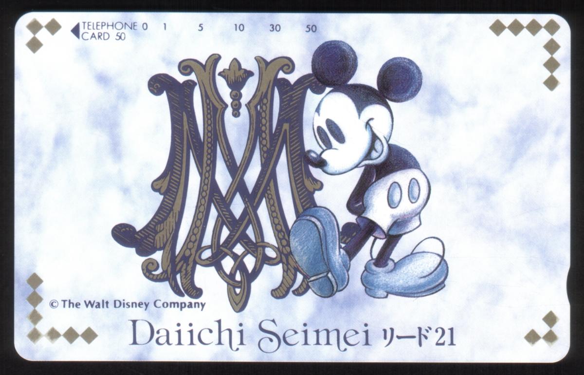 This phone card is from Japan and is mint condition with no holes. It is a collectible item featuring Mickey Mouse along with the Daiichi Seimei branding and the monogrammed "M" symbol, combining Disney imagery with Japanese corporate identity.