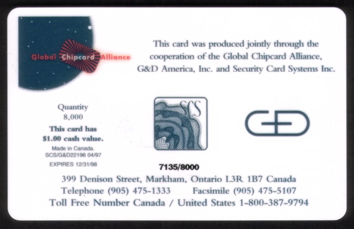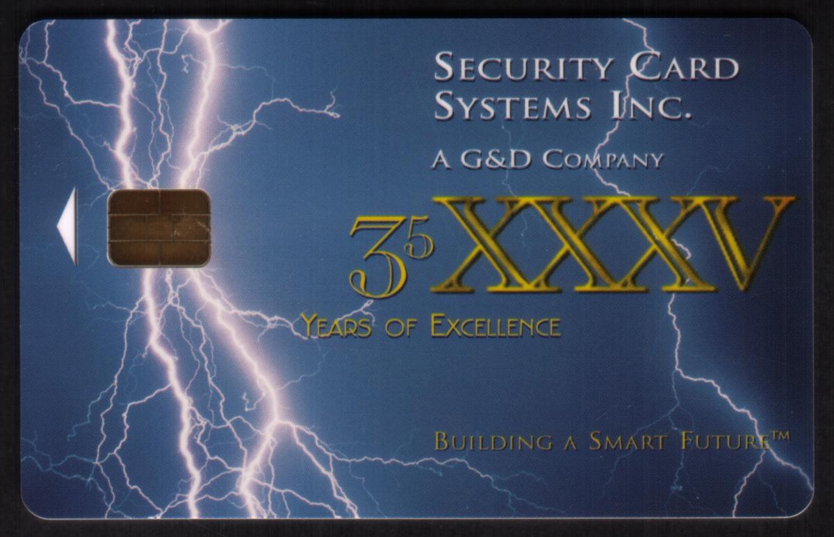 Keywords associated with this card include Canada, Global Chip Card Alliance, SCS, chip card, smart card, G&D America, Global Chip Card Alliance, promotional, stored value, smart cards, Canada Security Card Systems, and Lightning SEALED. This card commemorates 35 years of excellence in security card systems and smart card technology.