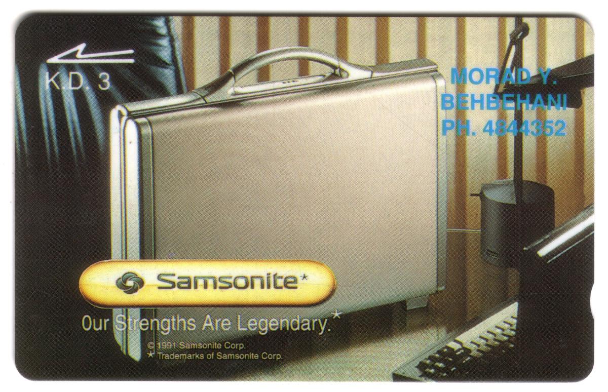Other cards showcase natural and cultural themes such as "Kuwait Desert Flowers," an old Kuwaiti mosque with palm-frond mats arranged on the floor, and an image of burning oil fields emitting dark black smoke. A commercial card advertising Samsonite brand luggage includes a silver briefcase along with contact information for Morad Y. Behbehani. Another corporate-inspired card promotes "United Gloss" and "Kuwait Aluminium" companies with their logos and contact details. A card illustrating a sunset over a seaside vista features wooden fishing poles in the water. A final card highlights a stylized engine with an oil droplet, marked "SG 10 K.D." and promoting "Kuwait Export Oil."