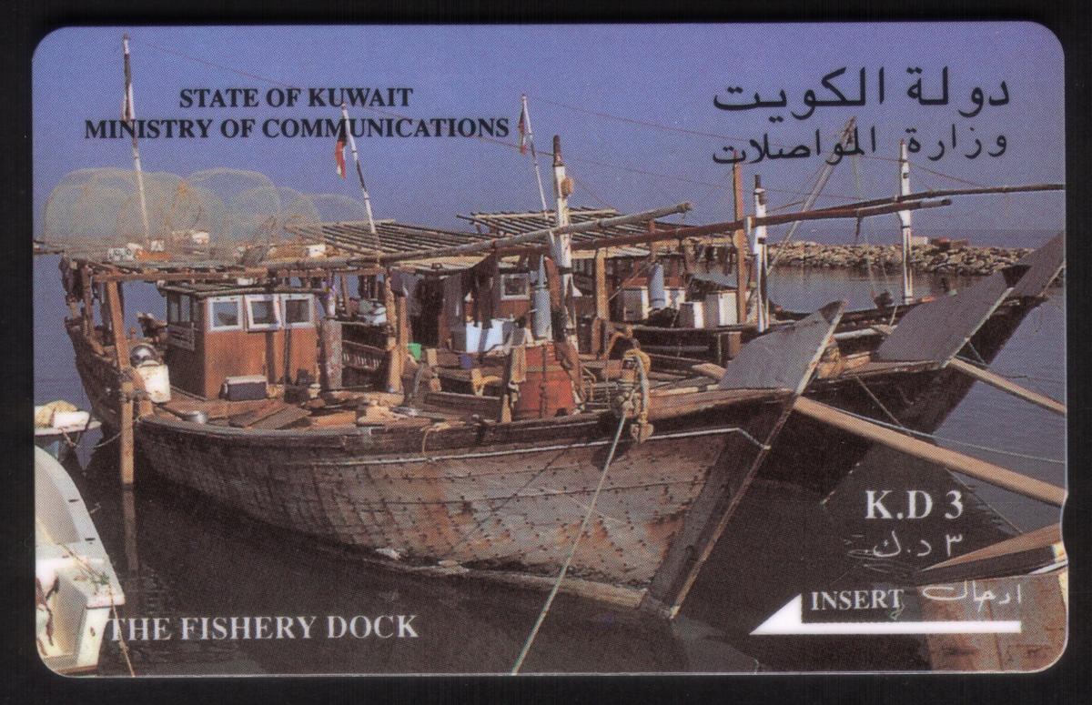 The collection includes cards with striking photographic and graphic images. One card displays a black silhouette world map on a white background with rate information for calls between 7 P.M. and 7 A.M., and 24 hours on Fridays and holidays. Another card features two white camels close together, while a third depicts traditional Kuwaiti wooden fishing boats docked at "The Fishery Dock." A nighttime image of Kuwait Towers with fireworks tremendously highlights the skyline on one of the cards.