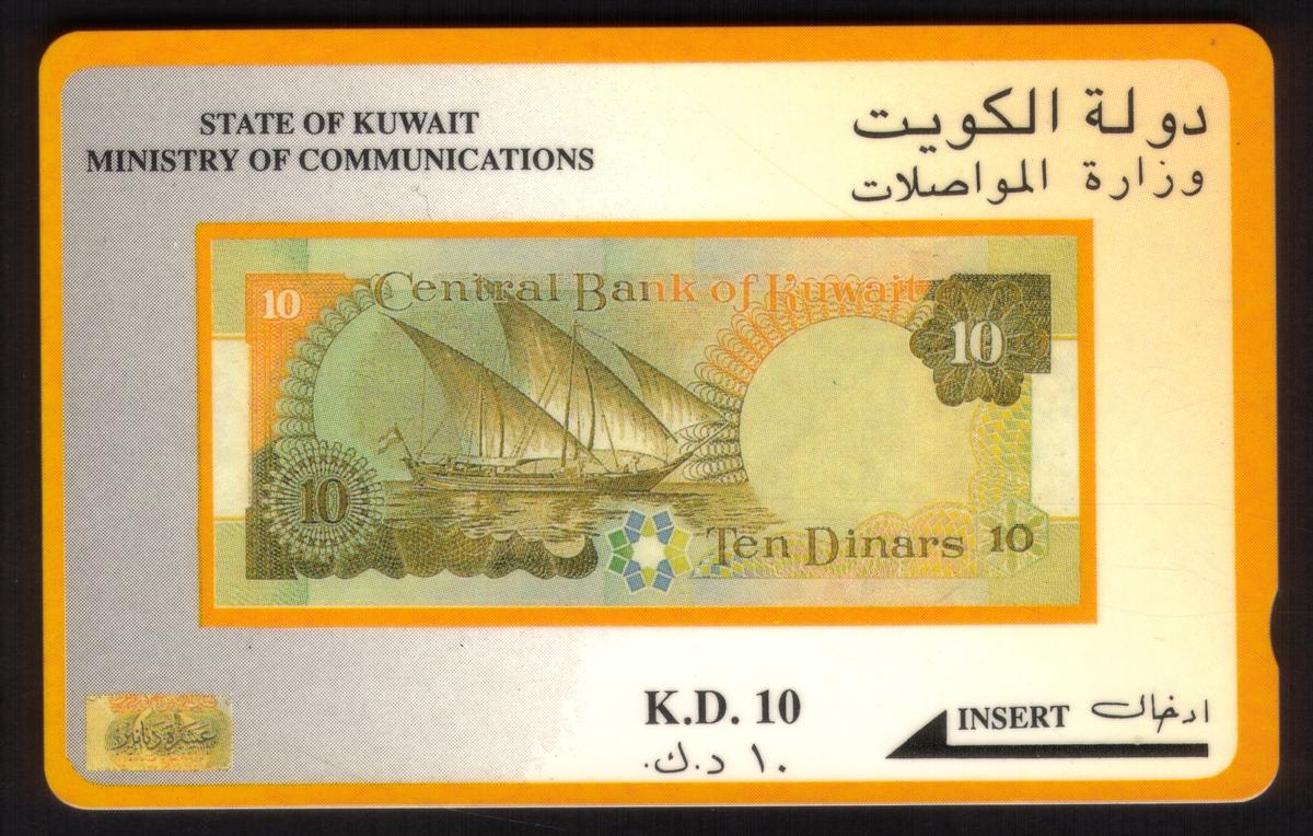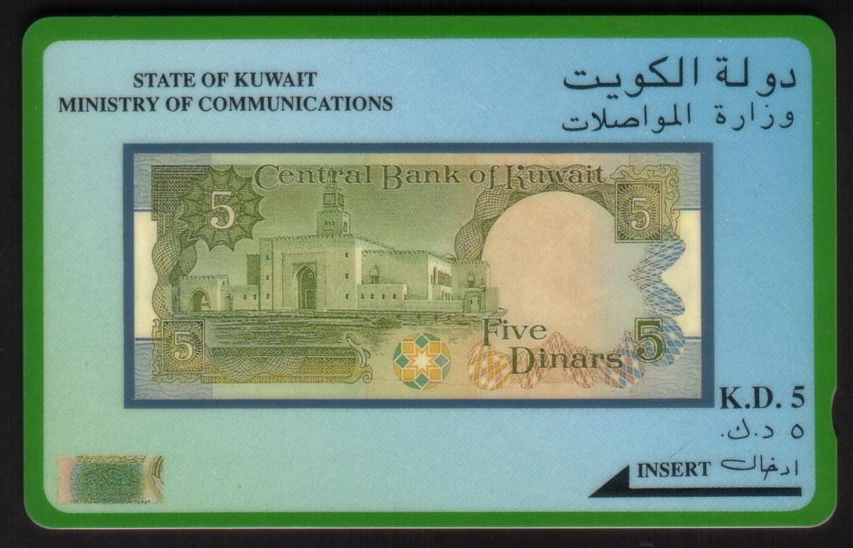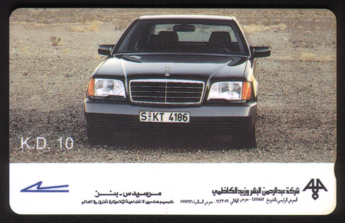 There are cards displaying currency images, for example, the Central Bank of Kuwait's 5 dinars banknote and 10 dinars banknote designs, clearly labeled with respective denominations and "STATE OF KUWAIT MINISTRY OF COMMUNICATIONS." A card depicts a black Mercedes-Benz sedan on a desert background with Arabic text for a company related to the automobile industry.