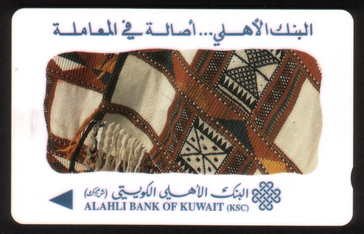 The final card is from Alahli Bank of Kuwait (KSC), featuring a fabric textile pattern with the bank's logo and slogan in Arabic, emphasizing tradition and authenticity. Each card has a stored value denoted in Kuwaiti Dinars (KD) ranging between KD 3 and KD 10.