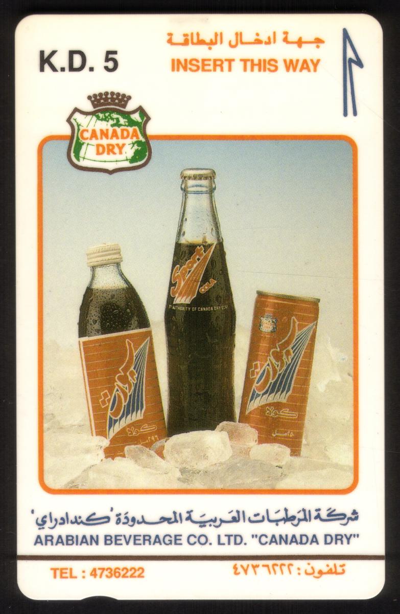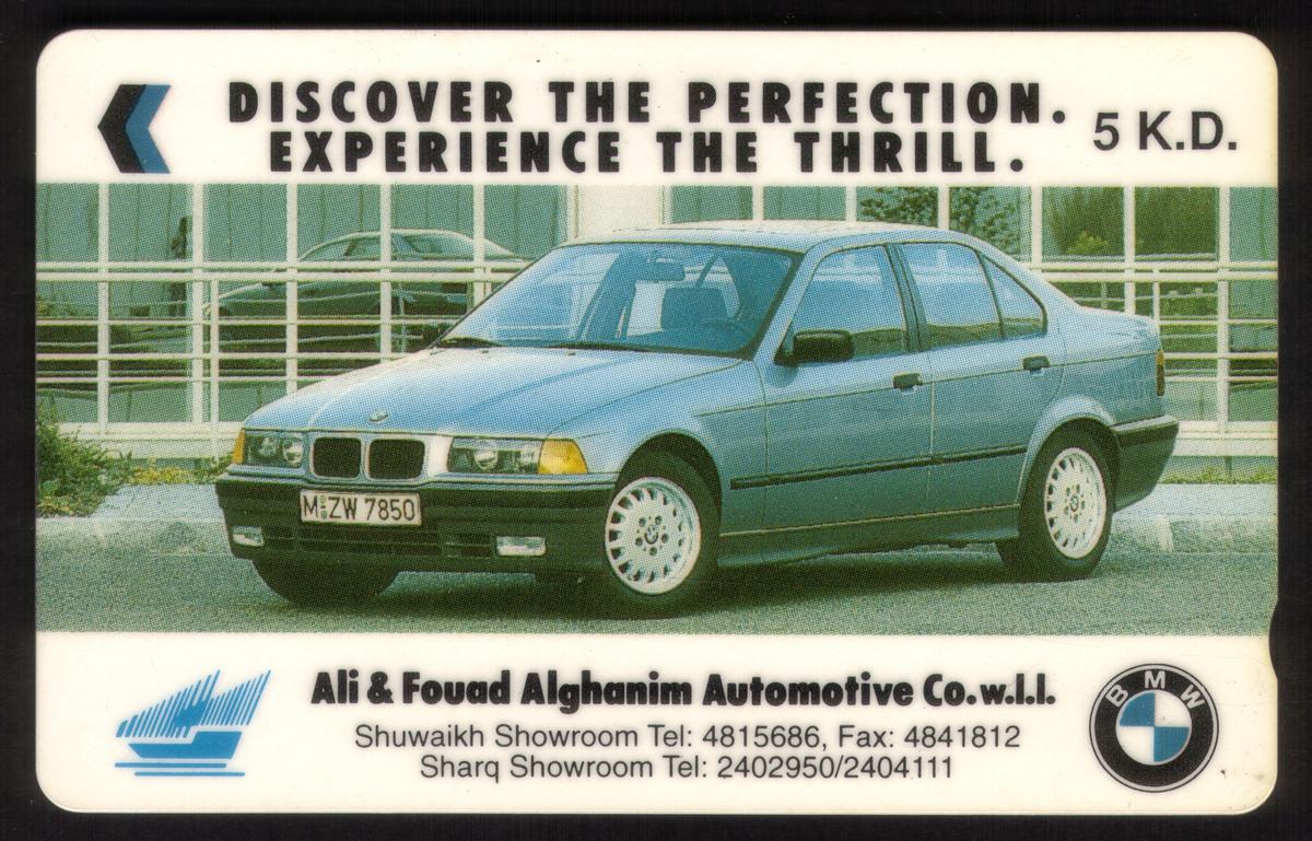 Several cards feature commercial advertisements. One card presents bottles and cans of "Canada Dry," branded with the Arabian Beverage Co. Ltd. logo and telephone contact information. Another card advertises BMW automobiles with a blue BMW car and the tagline "DISCOVER THE PERFECTION. EXPERIENCE THE THRILL." along with contact details for Ali & Fouad Alghanim Automotive Co. W.L.L.