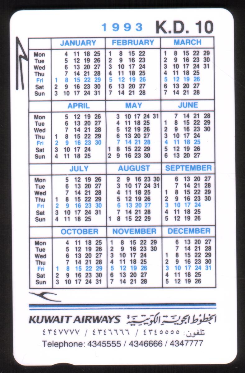 Additional cards include one promoting Kuwait Airways with destination cities "Lahore, Alexandria, Amsterdam" and telephone numbers printed in Arabic and English. Another card depicts a traditional neighborhood labeled "Al Muttabba Neighbourhood," showing beige buildings and a shaded street. A 1993 calendar card from Kuwait Airways is also part of the set, providing a calendar layout for the year 1993 along with phone numbers.