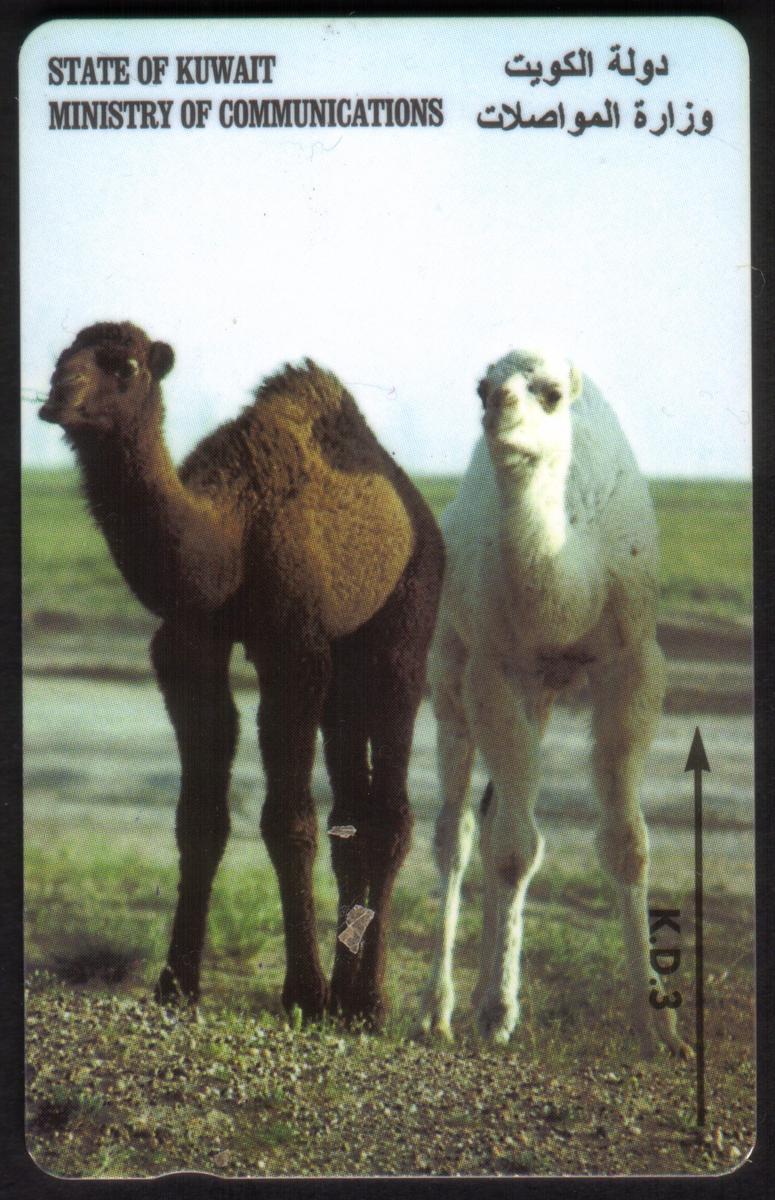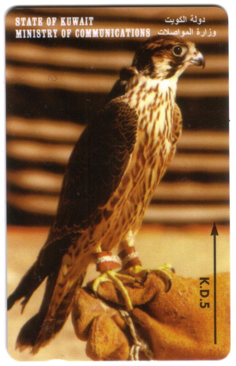 One card depicts two camels standing on a grassy plain, with Arabic and English text reading "STATE OF KUWAIT MINISTRY OF COMMUNICATIONS." Another card features a falcon perched on a gloved hand, highlighting a traditional aspect of Arabian heritage. There is also a card showing a Kuwait landscape with modern architecture, including the distinctive Kuwait Towers alongside sand-colored buildings, with "STATE OF KUWAIT MINISTRY OF COMMUNICATIONS" printed in both Arabic and English.