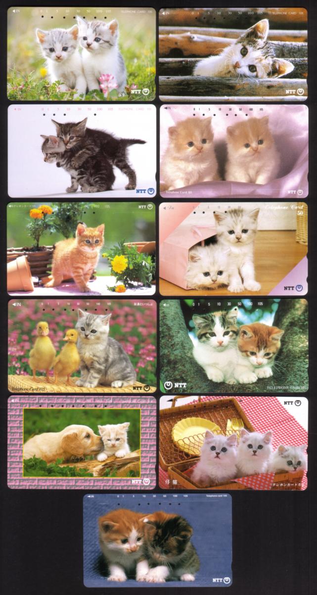 This collectible phone card from Japan features a vibrant photographic collage of 23 different cats, kittens, and kitties. Each feline image displays various breeds and colors, showcasing a wide variety of domestic cats. The card highlights the theme of animals and pets, specifically focusing on cats in multiple poses and settings. The artwork is detailed and colorful, accurately representing the softness and playful nature typical of kittens and adult cats.