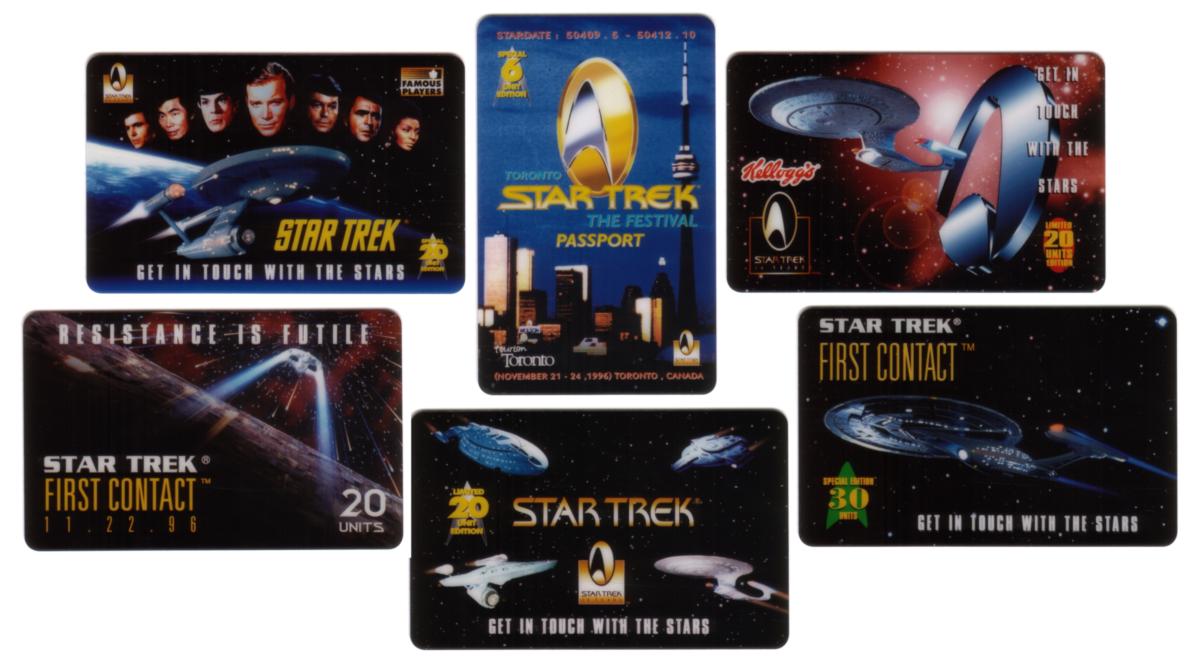 Together, these six different mint collectible Star Trek phone cards from Canada celebrate the franchise’s legacy with a mix of starships, characters, event promotions, and related branding, perfect for collectors and Star Trek fans.