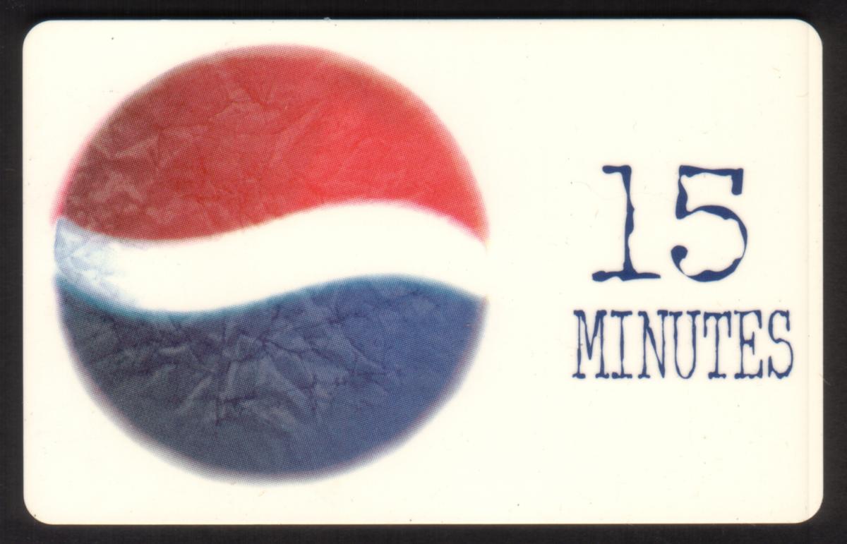 This collectible phone card features the iconic Pepsi-Cola logo prominently displayed on a white background. The logo is the classic circular design with a red upper half, white curved wave in the middle, and blue lower half. To the right of the logo, the card shows the text "15 MINUTES" in a stamped-style font, indicating the card’s usage value of 15 minutes.