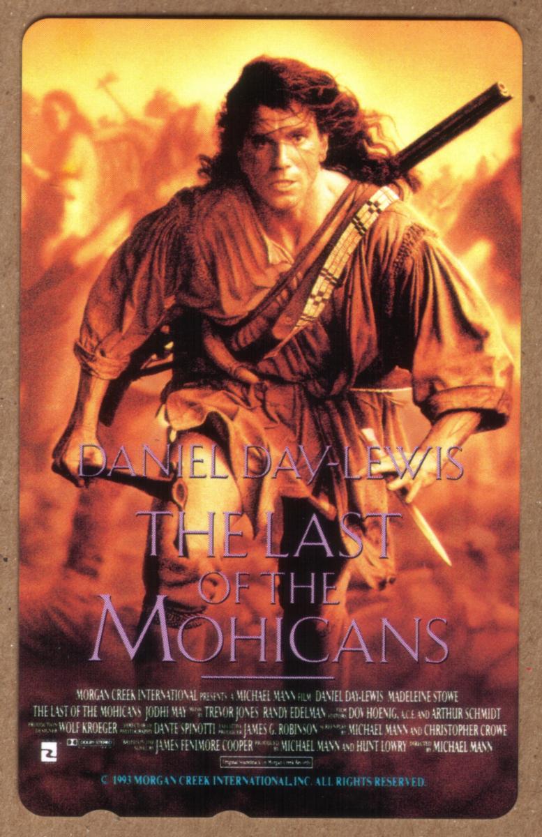This card is a 50-unit phone card, marked "50u," issued as a movie promo item reflecting the popularity of "The Last of the Mohicans" film. The detailed artwork and inclusion of the main star's name emphasize its value as a collectible tied to the 1993 historical drama.