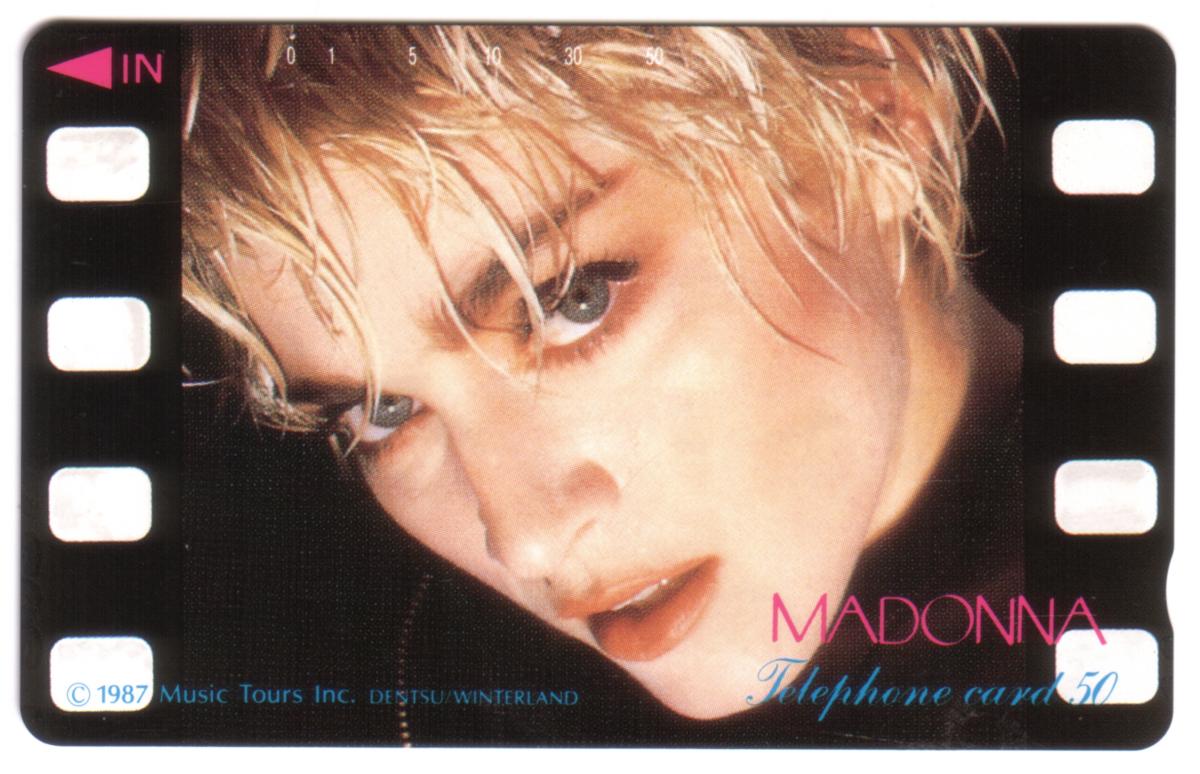 The lower left corner of the card contains the text "© 1987 Music Tours Inc. DESTIL WINTERLAND" in blue, indicating the year and the associated music company. On the bottom right, the card displays the pink text "MADONNA" and the blue script-style text "Telephone card 50," identifying the card’s nature and its value of 50 units.