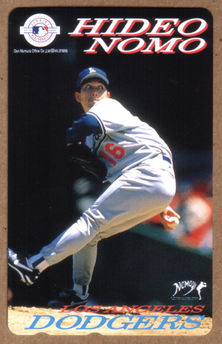 The card is in mint condition with no holes. It is a sports-themed collectible issued in Japan for the 1995 MLB season, celebrating Hideo Nomo’s impact as a prominent Japanese player in Major League Baseball, specifically for the Los Angeles Dodgers.