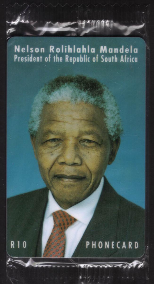 Text on the card includes "Nelson Rolihlahla Mandela President of the Republic of South Africa" printed in white at the top. The denomination "R10" and the word "PHONECARD" appear at the bottom corners of the card.