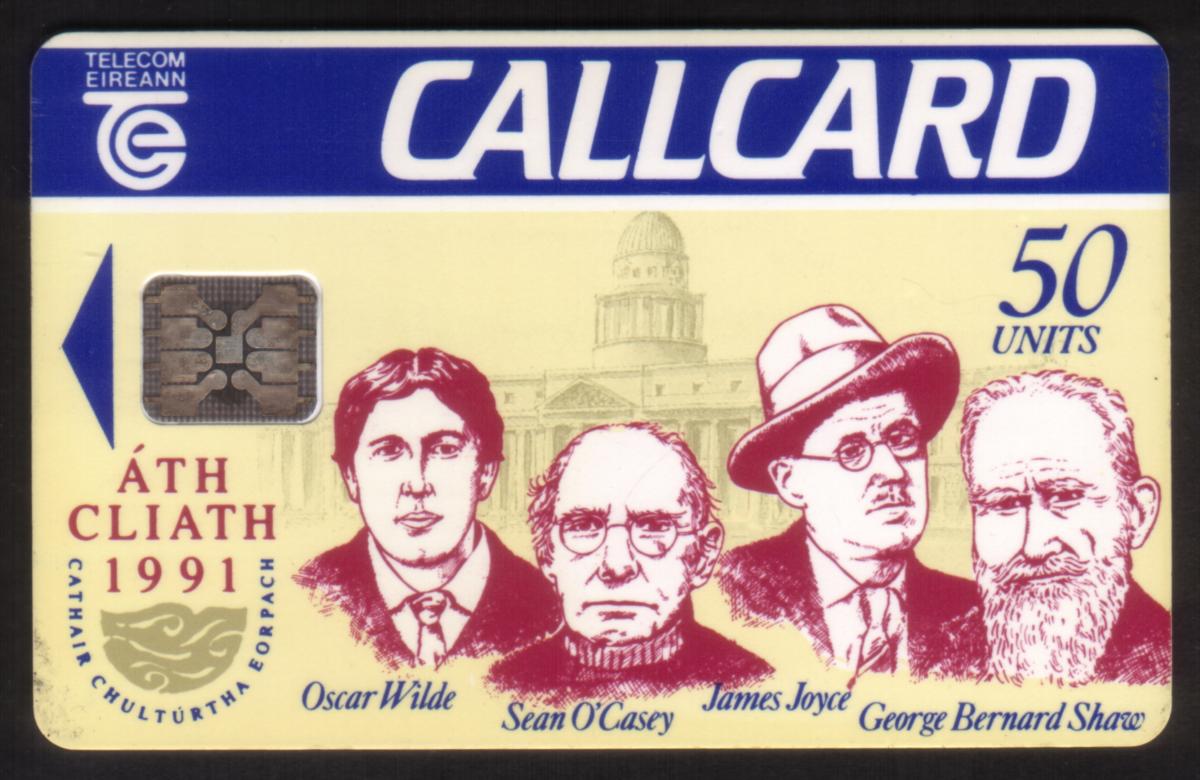 This collectible chip card from Telecom Eireann is a Callcard with a stored value of 50 units, issued in 1991. The card features prominent Irish literary and cultural figures, including Oscar Wilde, Sean O'Casey, James Joyce, and George Bernard Shaw, whose detailed portraits are displayed in a maroon ink across the front. Their names appear directly beneath each respective portrait in matching maroon text.