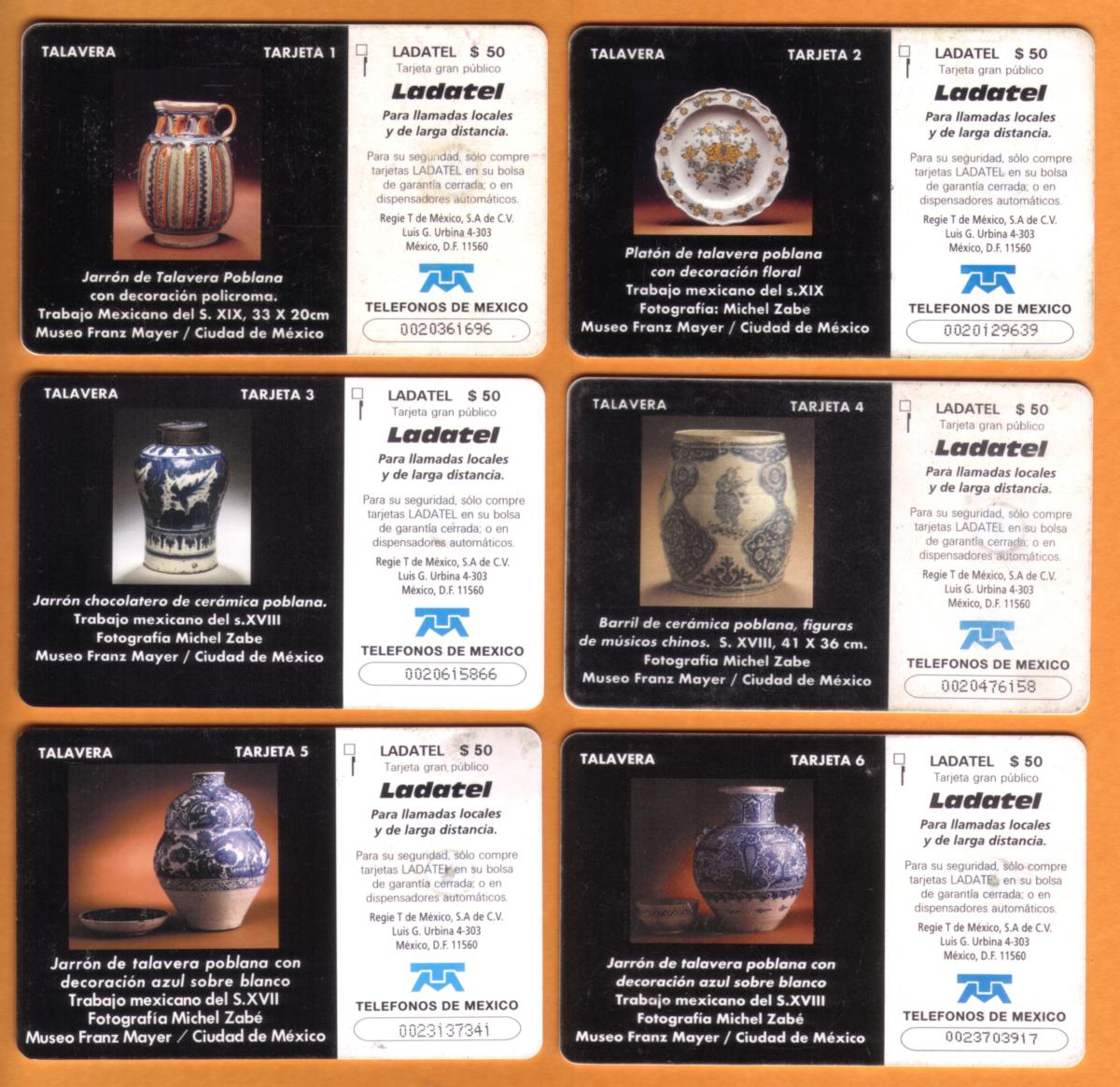 These collectible chip cards each feature detailed images of Talavera pottery from Mexico. The set includes six cards, all labeled with "LADATEL $50" and the text "CADUHU 3.50" or "LADATEL $50" indicating a stored value of 50 Pesos. Each card showcases a close-up view of different Talavera pottery pieces, highlighting their distinct intricate patterns and vibrant colors.