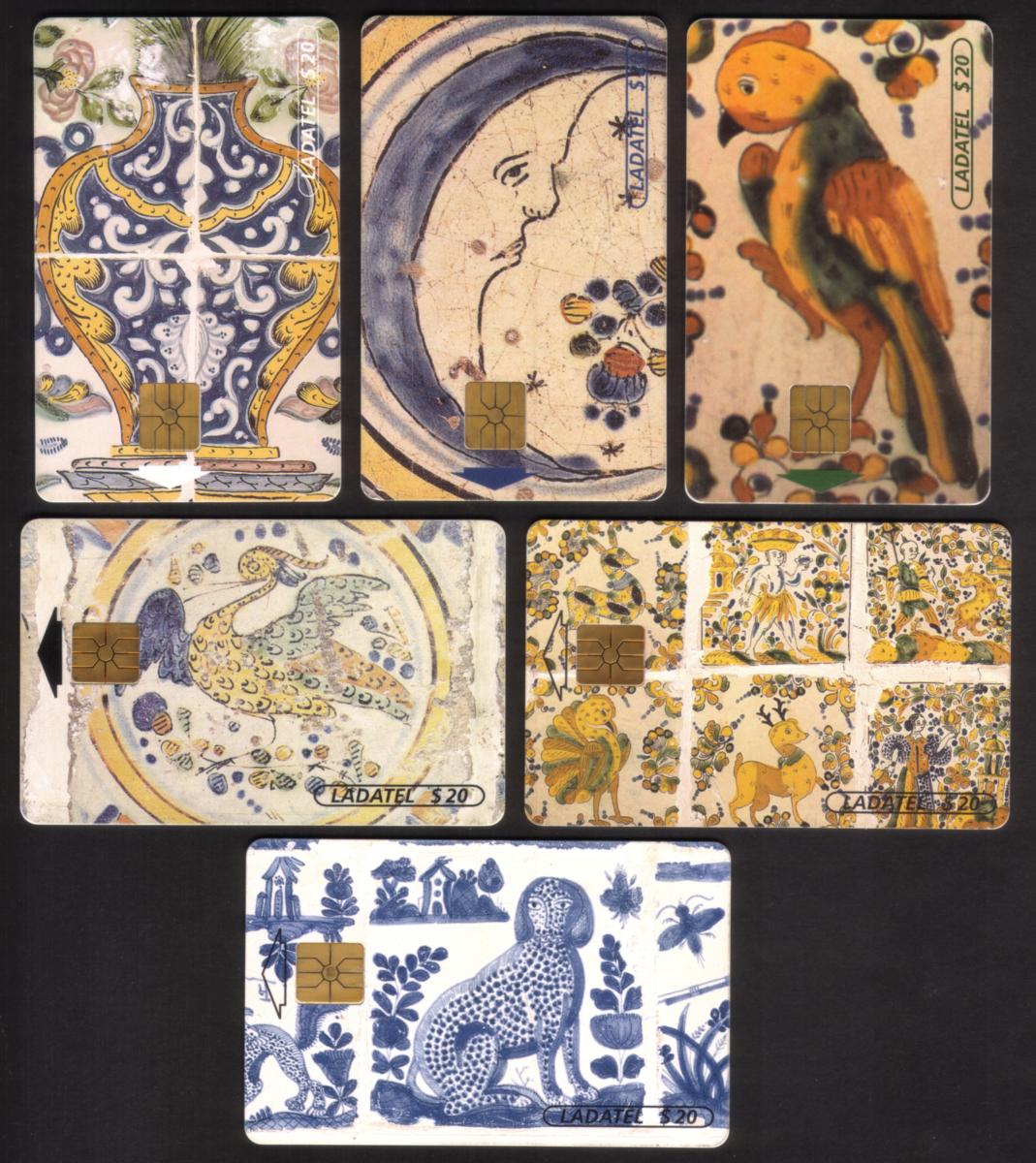 These six collectible chip cards are from Mexico TelMex and are stored value chip phone cards with a value of 20 Pesos each. They form a ceramic tiles set, featuring traditional Mexican Talavera-style art motifs, showcasing various colorful and intricate designs on each card.