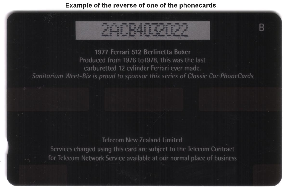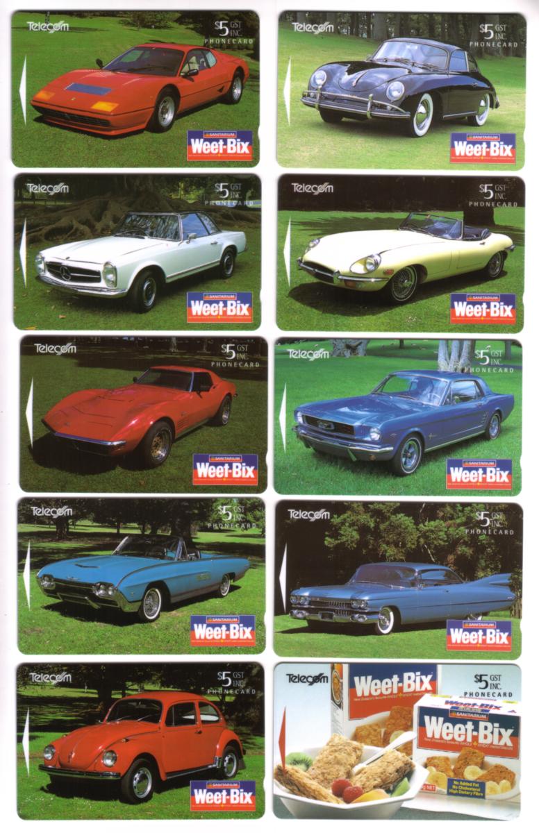 This complete set of ten collectible phone cards from New Zealand features classic automobiles as the main theme. Each card, issued by Telecom and endorsed by Weet-Bix, showcases a distinct vintage or classic car against a natural outdoor background with grass and trees. The cards each have a face value of 5 units, displayed in the top right corner.