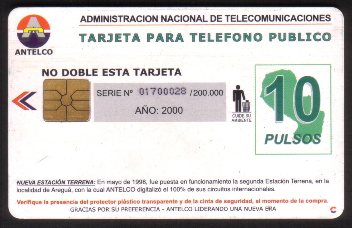 The top left corner of the card displays the word "Paraguay" in bold white letters, while the top right corner contains the Antelco logo alongside the flag of Paraguay. Just below the logo, the card’s value is marked as "10 PULSOS" in white text. This card is a stored value chip card intended for telecommunications use.