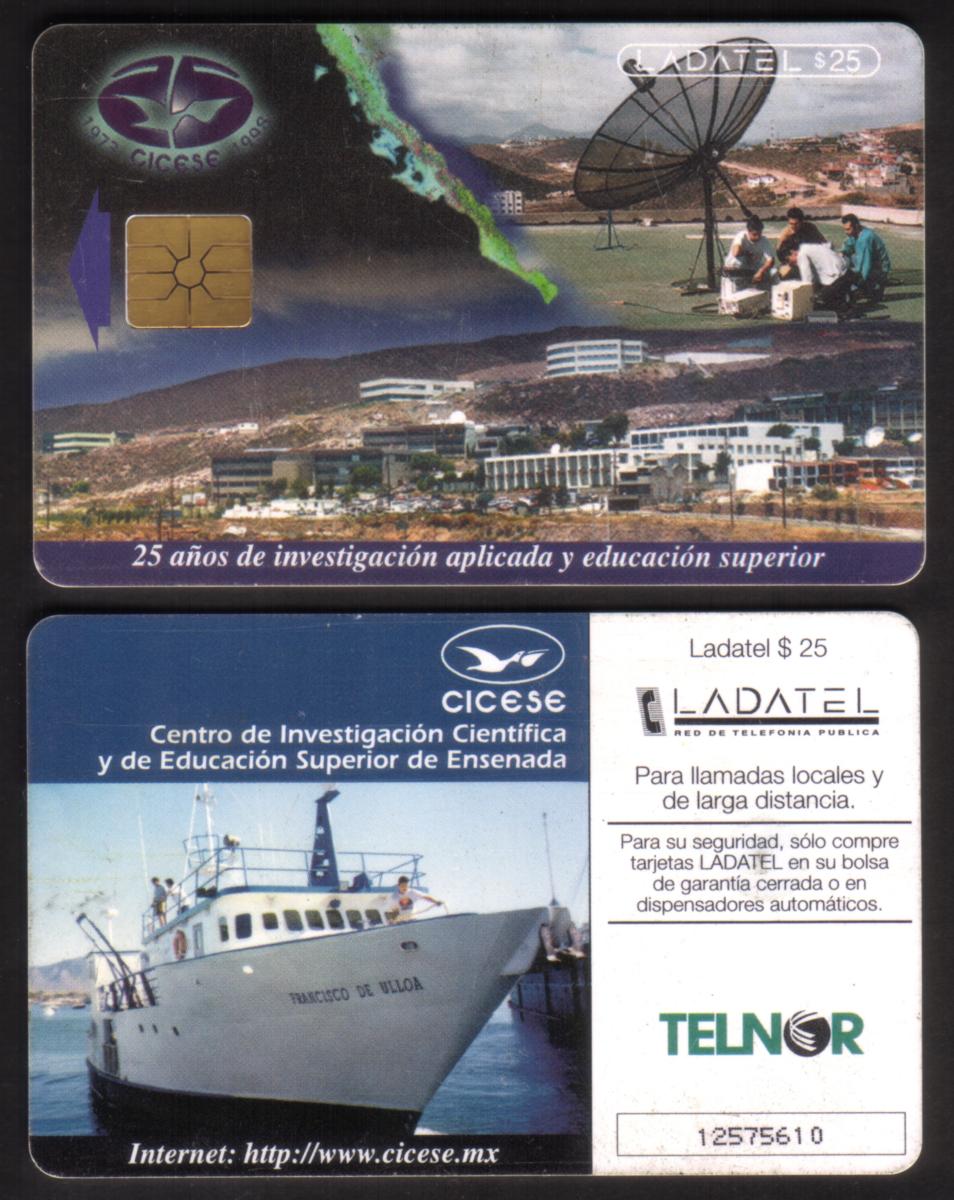 This chip card is a highly specific collectible related to science and maritime research in Mexico, highlighting CICESE’s milestone of 25 years in advancing science education and research. The presence of both Ladatel and Telnor logos connects it to Mexican telecommunications companies. The photographic style and clear branding make this card a notable item for collectors interested in scientific institutes, research vessels, and Mexican chip cards.