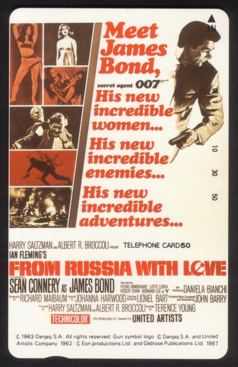 The card's artwork includes the official *From Russia With Love* branding alongside the 007 emblematic numbering, reinforcing its theme linked to the 1963 film starring Sean Connery. It is a special movie promo card issued in Japan, making it a collectible piece for fans of the James Bond series and movie memorabilia collectors. The design balances minimalism with strong franchise identifiers, showcasing the card’s role as a promotional item celebrating the James Bond legacy.