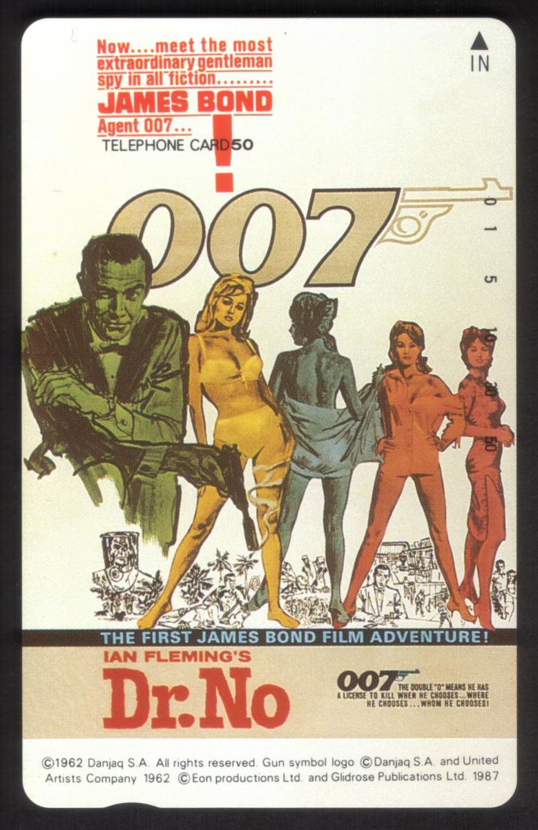 This collectible promotional card from Japan features iconic imagery related to the 1962 film "Dr. No," the first James Bond movie. The card prominently shows Sean Connery as James Bond, dressed in a classic dark suit and holding a pistol. The design includes the official "007" logo, linking directly to the James Bond franchise. The card is marked with the text "50u," indicating its value or denomination, and includes the phrase "Dr. No Movie Promo Card."