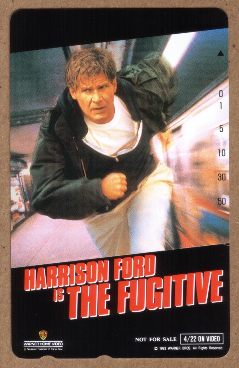 Overall, this card is in mint condition and has no holes. It is a Japanese-issued movie promotional phone card tied directly to the 1993 Warner Bros. film *The Fugitive*, featuring one of its main stars, Harrison Ford. This card serves as a collectible item reflecting the movie’s marketing campaign in Japan.