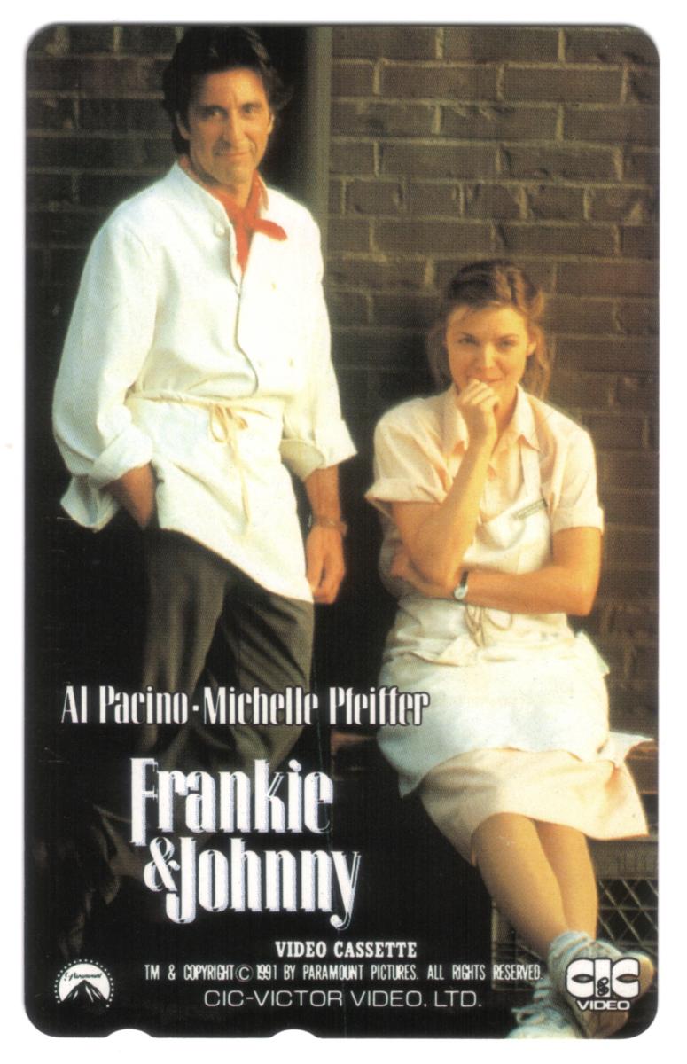 This collectible phone card from Japan promotes the Paramount Pictures movie "Frankie & Johnny," featuring actors Al Pacino and Michelle Pfeiffer. The front of the card prominently displays a photographic image of both Al Pacino and Michelle Pfeiffer in character, dressed in casual attire, suggesting a moment from the film. The text on the card identifies it as a movie promo piece, with "Frankie & Johnny" clearly shown along with the names of the two lead actors.