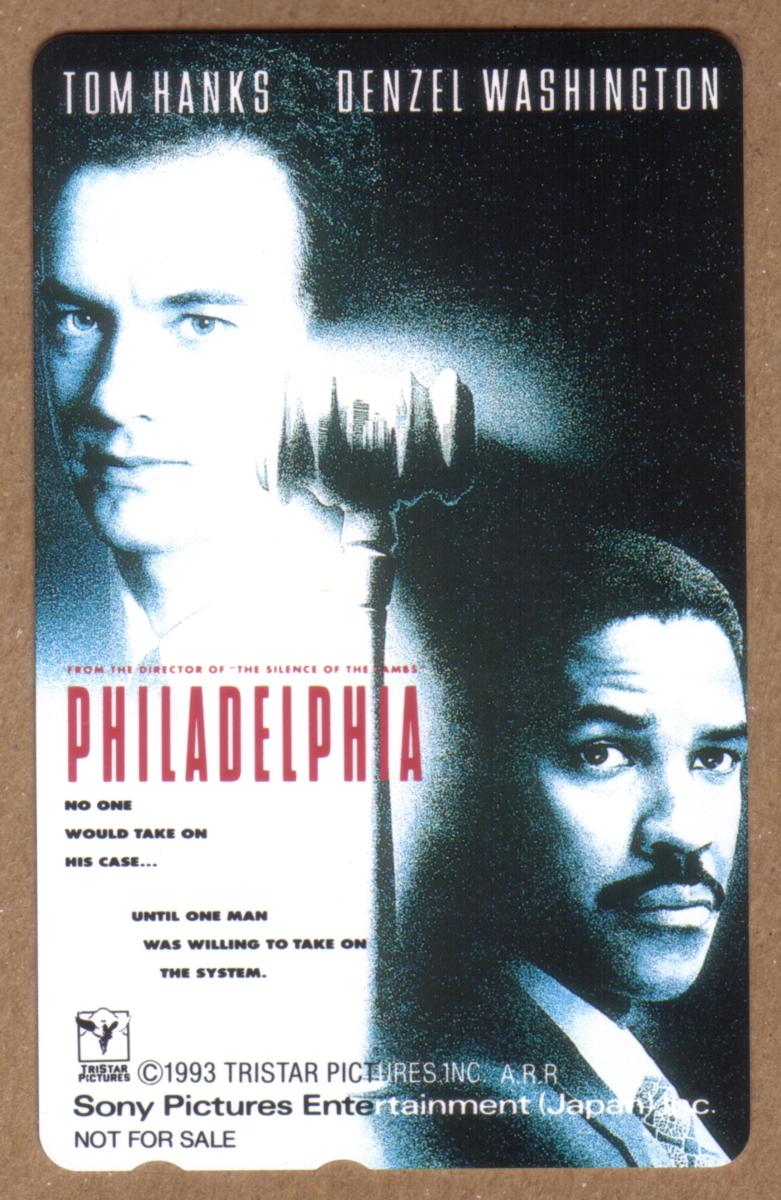 The card is in mint condition, with no holes, highlighting its value to collectors. It is a phone card issued in Japan, designed as a promotional item linked to the "Philadelphia" movie, which starred Tom Hanks and Denzel Washington. The overall layout is clean and professional, focusing on the actors and associated movie branding without any additional imagery or themes.
